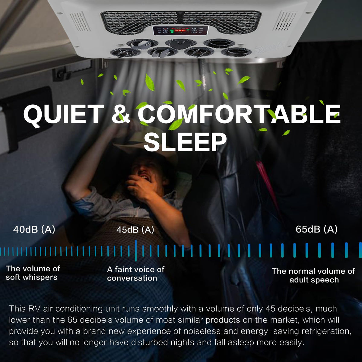 This RV roof air conditioners is non-ducted configuration, suitable for most caravan models, it is more compatible and easier to install, providing the ideal air conditioning solution for your RV. RV air conditioner dimensions are: 66cm * 72 cm * 16 cm (25.98 in * 28.35 in * 6.3 in). The sunroof size needs to be larger than 22.5 cm * 30 cm (8.86 in * 11.8 in) and smaller than 44 cm * 58 cm (17.32 in * 22.83 in). Warm Tip: Please check the size of the sunroof before purchase to avoid unnecessary loss. This RV rooftop air conditioner has cooling and heating capabilities, whether you want to provide quick cooling during a hot forest camping trip or heating your RV on a cold winter day, our 24V air conditioner can easily meet your needs. This RV air conditioning unit runs smoothly with a volume of only 45 decibels, and will provide you with a new experience of noiseless and energy-saving cooling, so that you will no longer have disturbed night, and it will be easier for you to fall asleep. This electric air conditioner is powered by a battery (generator).Even if the engine is turned off, you can still use the air conditioner, which not only saves fuel, but is also more energy efficient, economical and environmentally friendly. This rooftop air conditioner has a very wide range of application, which can be applied to trucks, RV, campers, vans, excavators, passenger cars, agricultural vehicles, construction vehicles and ships, etc. You don't need to worry about after-sales problems, our 24V air conditioner has up to 18 months warranty service, if you have any questions or problems in the process of using our roof top air conditioner, please feel free to contact us, we will give you a satisfactory answer at the first time.
