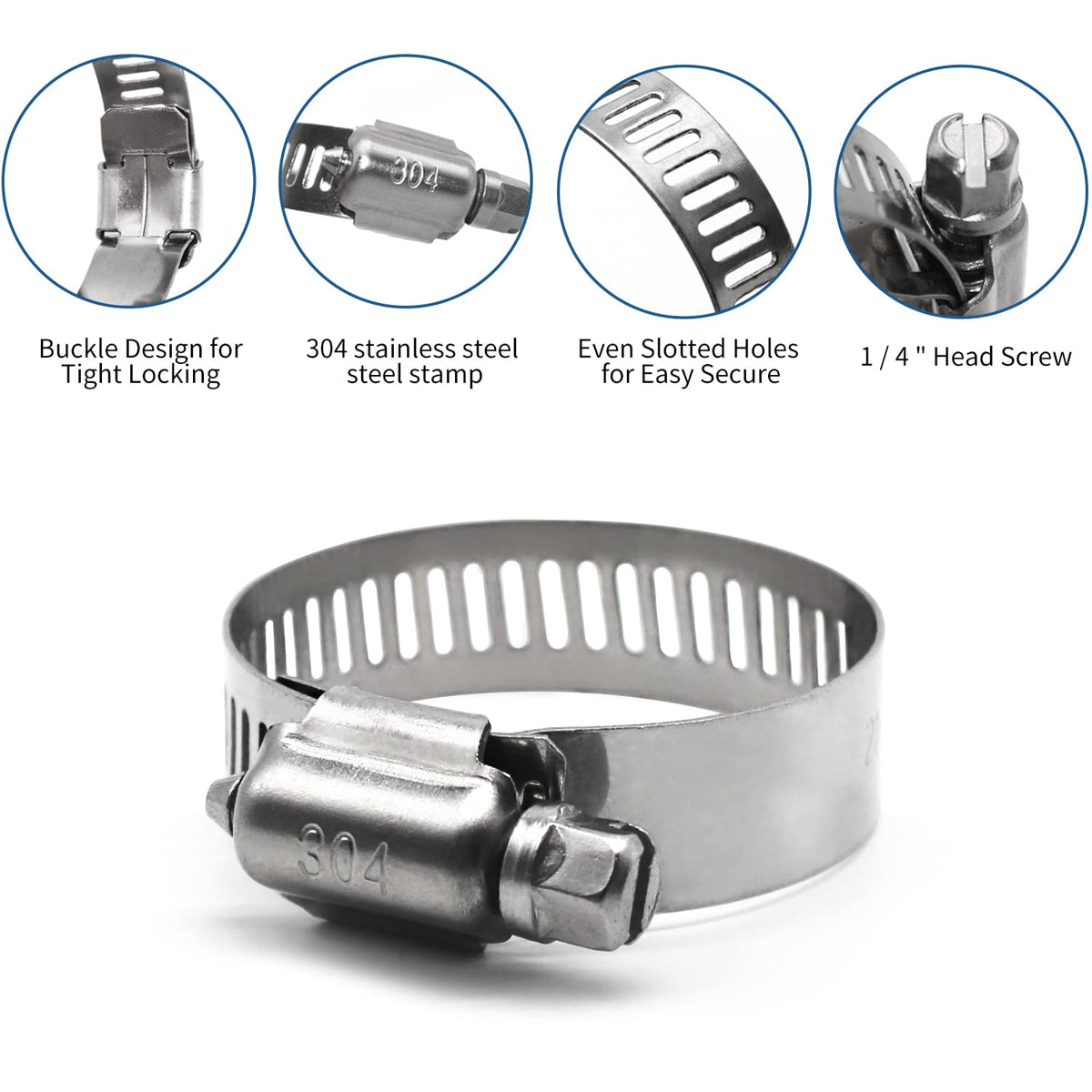 Q: Are these hose clamps durable and resistant to corrosion?A: Yes, these hose clamps are made from 304 stainless steel, which is known for its corrosion resistance and durability. They will not rust or break, ensuring long-lasting performance in various environments.