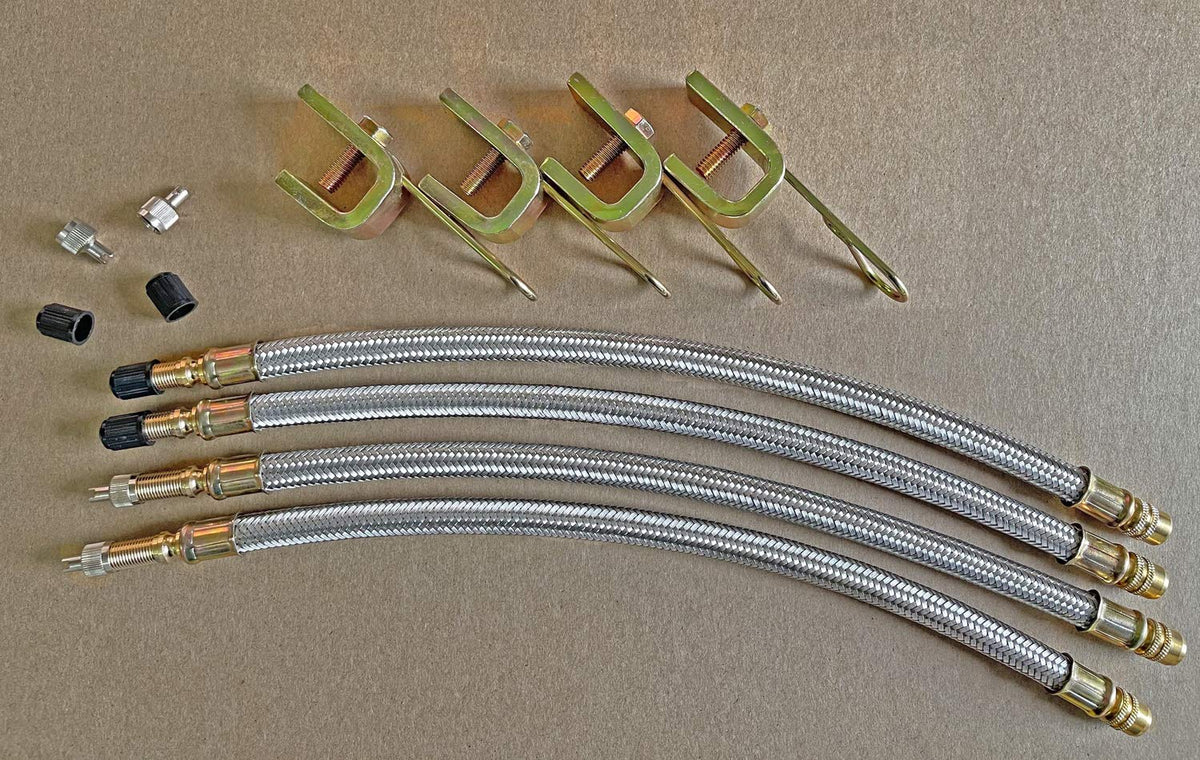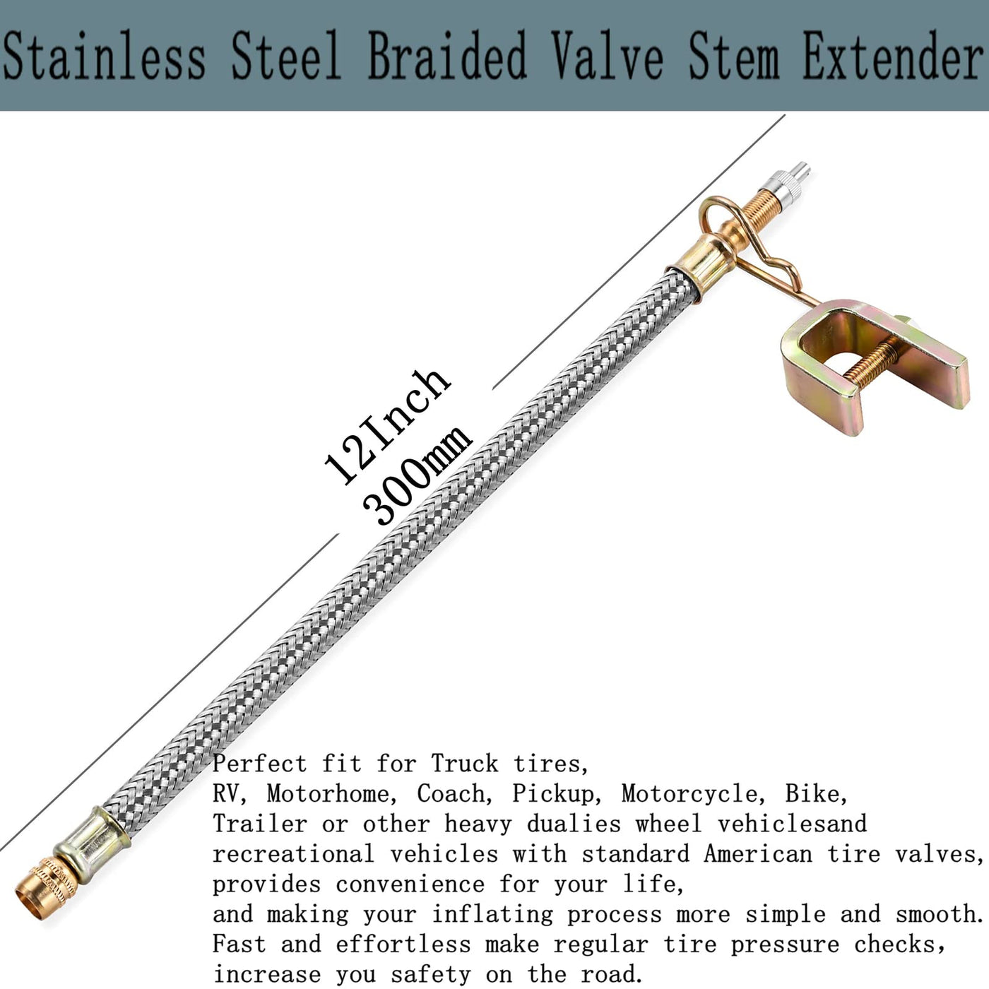 Material:304 stainless steel Length:12inch approx.300 mm. Reliable and durable:Made of copper nut and stainless steel braided flexible hose with an Heavey duty alloy clip to fix the adapter. Universal Type: Work With Tire Valve Directly, Have A Clamp / Fastener To Work Directly with Dual Wheel. Easy Work. Fits standard valve cap treads. Fit for trucks, RVs, campers, trailers, or other heavy vehicles