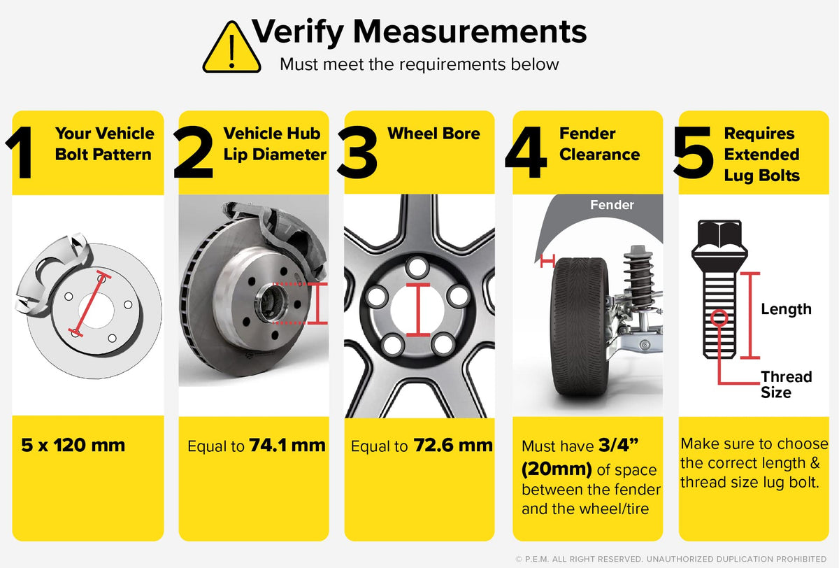NOTE: These are Centerbore Adapters. The Bore of these spacers are 74.1mm, and the Lip diameter is 72.6mm. This is meant to allow you to perfectly center wheels with 72.6mm Bore. This is NOT meant for wheels with 74.1mm bore. [ SPECIFICATIONS ] Thickness: 3/4'' (20mm) Bolt Pattern: 5x120 Vehicle Side Bore: 74.1mm Wheel Side Lip Diameter: 72.6mm [ FITMENTS ] Compatible With BMW 2001-2003 - 525i Compatible With BMW 1997-2000 - 528i Compatible With BMW 2001-2003 - 530i Compatible With BMW 1997-2003 - 540i Compatible With BMW 2000-2003 - M5 Compatible With BMW 2007-2018 - X5 Compatible With BMW 2008-2014 - X6 (Front only) Compatible With BMW 2015-2019 - X6 WARNING: READ BEFORE PURCHASE/INSTALLATION - IMPROPER INSTALLATION, INCOMPATIBILITY, OR FAILURE TO RE-TORQUE HARDWARE CAN CAUSE LOSS OF WHEEL AND RESULT IN SERIOUS ACCIDENT, INJURY OR DEATH - Do NOT install without extended lug bolts (Not included in this listing) - Buyers are responsible for acquiring the correct lug bolt thread size, length, and seat - A torque wrench is required. Don't use air or impact wrenches - Check and re-torque nuts/bolts within 25-50 miles of installation - Measure wheel gap for clearance. You'll need at least 3/4'' (20mm) of clearance to prevent wheel/tire from touching the fender