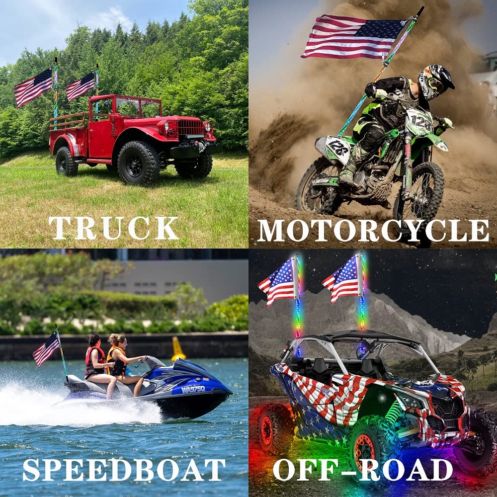 Q: Are these whip lights compatible with different types of vehicles?A: Yes, these LED whip lights are versatile and can be installed on a variety of vehicles including UTVs, ATVs, boats, trucks, RZRs, Can-am vehicles, and more.