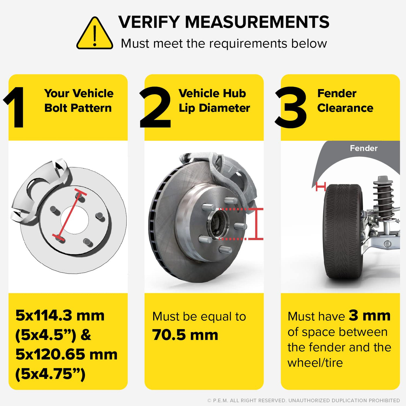 Dual-Drilled design reduces weight for optimal performance. Fitment, Quality, & Durability Tested [ FITMENTS ] Compatible with Buick 1979-1985 Riviera Compatible with Cadillac 1979-1985 Eldorado, 2003-2009 XLR Compatible with Ford 1994-2020 Mustang, 2006-2010 Edge, 1991-2011 Crown Victoria, 1981-2012 Ranger, 1991-2010 Explorer, 2020 Explorer, 1990-2010 Explorer Sport Trac Compatible with Chevrolet 1995-2011 Blazer, 1982-2002 Camaro, 1968-2020 Corvette, 1982-1987 El Camino, 1982-2011 S10, 1982-1994 S10 Blazer Compatible with GMC 1982-1991 S15, 1982-2005 Jimmy, 1982-2004 Sonoma, 1998-2000 Envoy, 1991-1992 Syclone, 1992-1993 Typhoon Compatible with Lincoln 1984-1992 Mark 7, 1981-2011 Town Car, 2003-2010 Aviator, 2019-2020 Aviator Compatible with Pontiac 1977-1981 Catalina, 1982-2002 Firebird, 1973-1980 Grand Am, 1978-1987 Grand Prix, 1964-1987 GTO, 1980-1985 Phoenix, 1984-1997 Trans Am, 1990-1997 Trans Sport, 1963-1981 Lemans WARNING: READ BEFORE PURCHASE/INSTALLATION - IMPROPER INSTALLATION, INCOMPATIBILITY, OR FAILURE TO RE-TORQUE HARDWARE CAN CAUSE LOSS OF WHEEL AND RESULT IN SERIOUS ACCIDENT, INJURY OR DEATH - May require extended wheel studs or extended lug bolts (Not included in this listing). Buyers need to ensure to get 6-9 full turns of the lugs when tightening - A torque wrench is required. Don't use air or impact wrenches - Check and re-torque nuts/bolts within 25-50 miles of installation - Measure wheel gap for clearance. You'll need at least 3mm of clearance to prevent wheel/tire from touching the fender