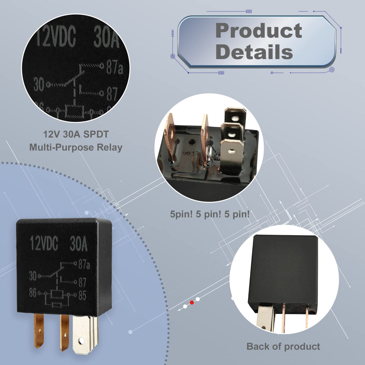 2Pcs 5 Pin 12V 30A Relay, Multi Purpose Automotive Relay Black Starter Relay, Car Starter Switch Relays, High Performance Starte