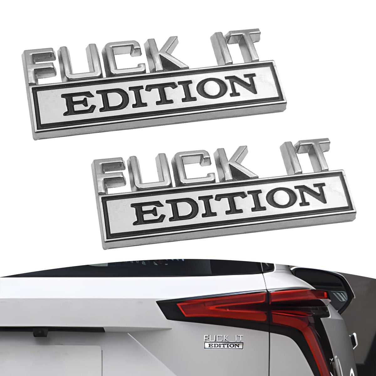 Q: What makes the Fuck-IT Edition emblem stand out from other car decals?A: The Fuck-IT Edition emblem features a unique design that adds a bold and domineering look to your vehicle. Made from high-quality metal, it not only enhances the appearance of your car but also showcases your personality, setting it apart from common plastic decals.