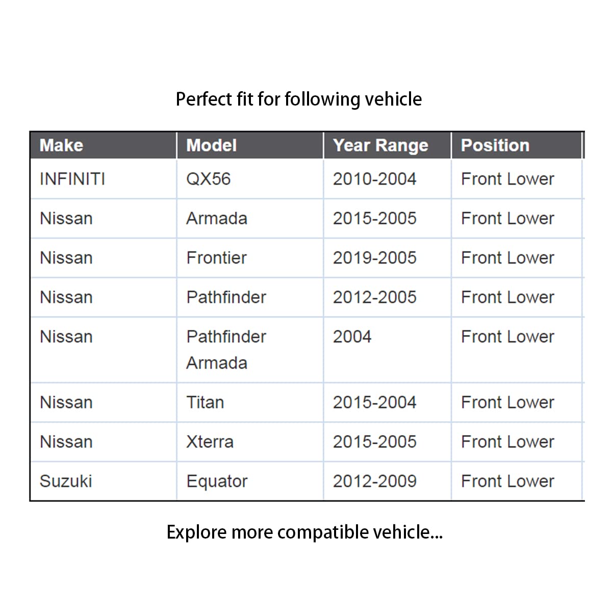 Package Includes: 2x Front Lower Ball Joint - K80647 Fitment: Compatible with 2004-2010 INFINITI QX56 Compatible with 2005-2015 Nissan Armada Compatible with 2005-2019 Nissan Frontier Compatible with 2005-2012 Nissan Pathfinder Compatible with 2004 Nissan Pathfinder Armada Compatible with 2004-2015 Nissan Titan Compatible with 2005-2015 Nissan Xterra Compatible with 2009-2012 Suzuki Equator