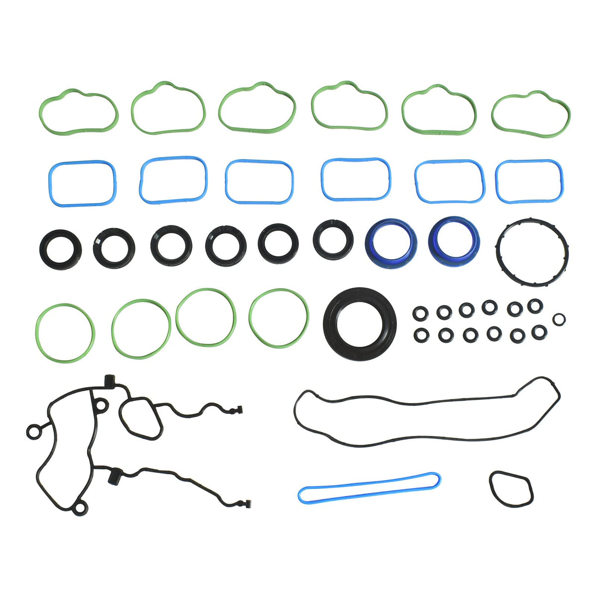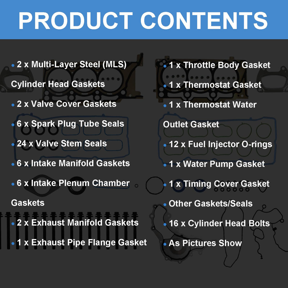 Q: What components are included in the head gasket kit?A: The kit includes essential components such as 2 Multi-Layer Steel (MLS) Cylinder Head Gaskets, 2 Valve Cover Gaskets, 6 Spark Plug Tube Seals, 24 Valve Stem Seals, 6 Intake Manifold Gaskets, and additional gaskets and seals, as well as 16 Cylinder Head Bolts.