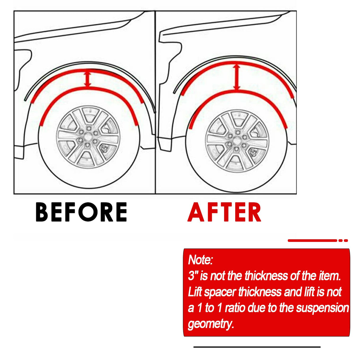 Q: Will installing this lift kit improve my truck's appearance?A: Yes, installing the 3" Front Leveling Lift Kit enhances the overall look of your vehicle by providing increased ground clearance. This allows you to fit larger custom rims and tires, giving your truck a more aggressive stance.