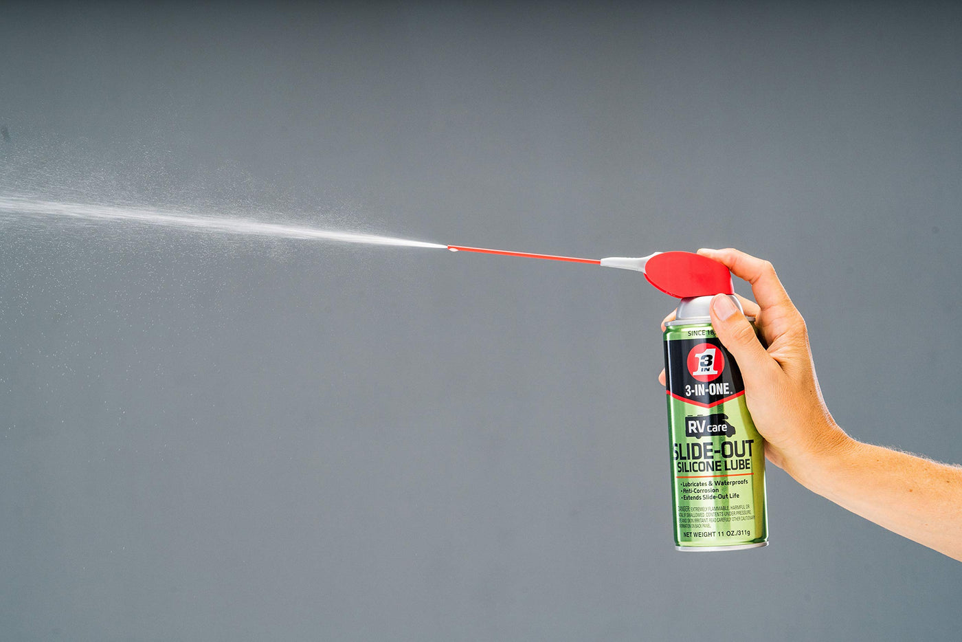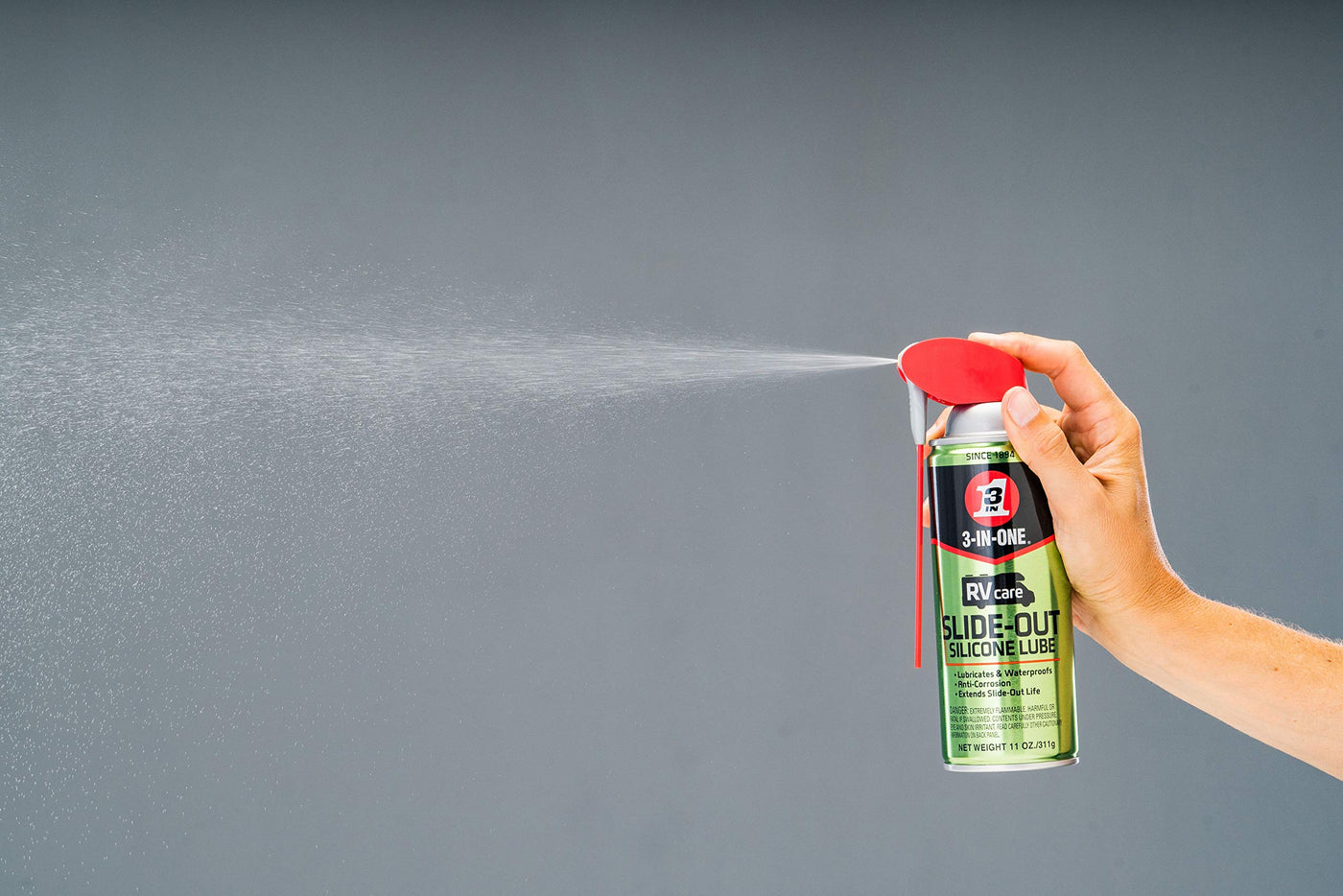 Q: What is the primary use of 3-IN-ONE RVcare Slide-Out Silicone Lube?A: The 3-IN-ONE RVcare Slide-Out Silicone Lube is specially formulated to lubricate and waterproof slide-outs, ensuring they run smoothly without sticking or squeaking.