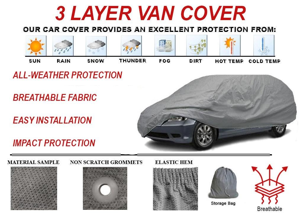 This Van Cover will provide all year round protection to your car. -It will efficiently shield your cars paint from all finish-destroying agents: sun, rain, snow, dust, dirt, tree sap and other corruptive elements. -The cover will minimize accidental bumps, dings, and scratches. You will reduce the need for car washes, repair shops and will enjoy your ride in a brand-new looking van all year round. Investing in our quality cover is not only a practical move but also the perfect option for maintaining the cars exterior. Condition: Brand New, Color: Gray, PACKAGE INCLUDES: Brand New Van Cover. Storage Pouch, Antenna Patch. All Weather indoor and outdoor protection: outdoor car cover is breathable and provides protection from: snow, rain, dust, dirt , sun. This cover is ideal for high moisture climates all across the US and Canada. Soft and Non-Abrasive: Will not scratch clear-coat on paint. Made from Technologically advanced, composite fabric material with protective film in between to protect fine automotive finishes. 100% Breathable Material: One remarkable characteristic of our cover is that it allows air to circulate, preventing moisture from settling on your car and ruining its paint. Dust Protection: Our cover shields your car from fine dust. Whether indoors or out, when dust sits on your paint it turns abrasive and causes scratches. Dirt protection: The car will stay cleaner longer and will require fewer washes. Car Cover will keep moisture and salt from your vehicle. This car cover has an elasticized hem: To ensure a tight fit. Cable Lock Ready: Cover has 2 built-in, reinforced, scratch-proof grommets to tie or lock down your cover with cable lock kit (sold separately) Semi-custom fit: To accommodate most cars in the industry Storage Bag included: For convenient storage of your cover, when not is use.
