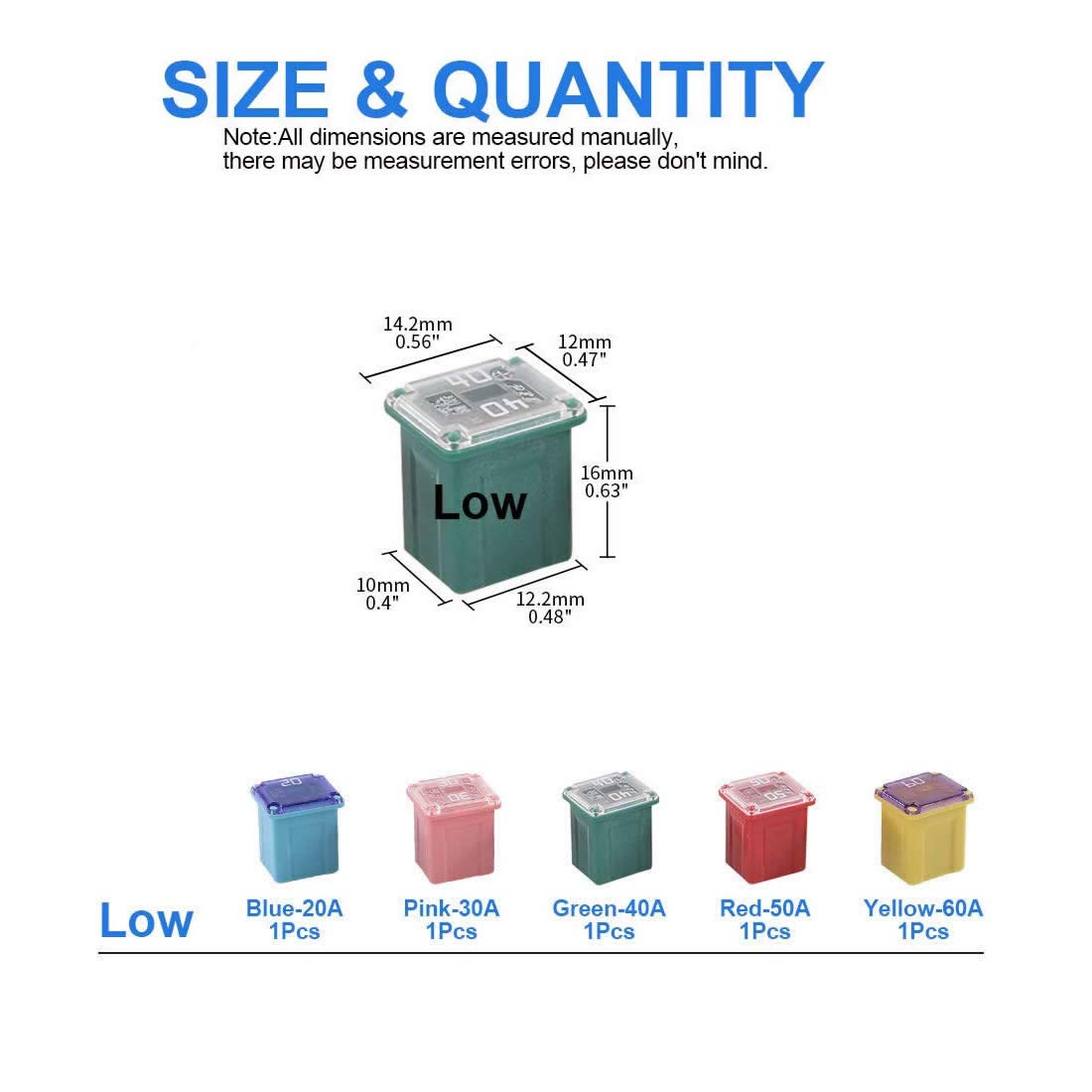 30Pcs Automotive Low Profile Box Shaped Mini Fuse 20A 30A 40A 50A 60A Fuse Assortment KitWhy choose us:? These standard fuse are made of premium material, safer than normal fuses.? Compared with your local automotive store, they are cheaper than factory replacements.? A perfect solution for your automotive wiring and electrical equipment.? Protecting your vehicle and electrical devices from a short circuit or overload.Package Include:Low Profile:Blue 20amp x 6pcpink 30amp x 6pcgreen 40amp x 6pcred 50amp x 6pcyellow 60amp x 6pcVersatile: widely used on car, truck, SUV, home, boat, camper/RV, ATV, UTV, golf cart, and more electrical devicess. Please attention Don't get caught without the right fuses for your truck or SUV!?Note?:? Please check the specific size of the product according to the picture. ? If you have any questions, please feel free to contact us and we will try our best to help you.