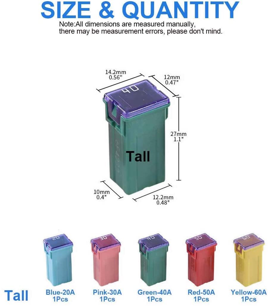 30Pcs Automotive Tall Profile Box Shaped Mini Fuse 20A 30A 40A 50A 60A Fuse Assortment Kit Why choose us: ? These standard fuse are made of premium material, safer than normal fuses. ? Compared with your local automotive store, they are cheaper than factory replacements. ? A perfect solution for your automotive wiring and electrical equipment. ? Protecting your vehicle and electrical devices from a short circuit or overload. Package Include: Tall Profile: Blue 20amp x 6pc pink 30amp x 6pc green 40amp x 6pc red 50amp x 6pc yellow 60amp x 6pc Versatile: widely used on car, truck, SUV, home, boat, camper/RV, ATV, UTV, golf cart, and more electrical devicess. Please attention Don't get caught without the right fuses for your truck or SUV! ?Note?: ? Please check the specific size of the product according to the picture. ? If you have any questions, please feel free to contact us and we will try our best to help you.