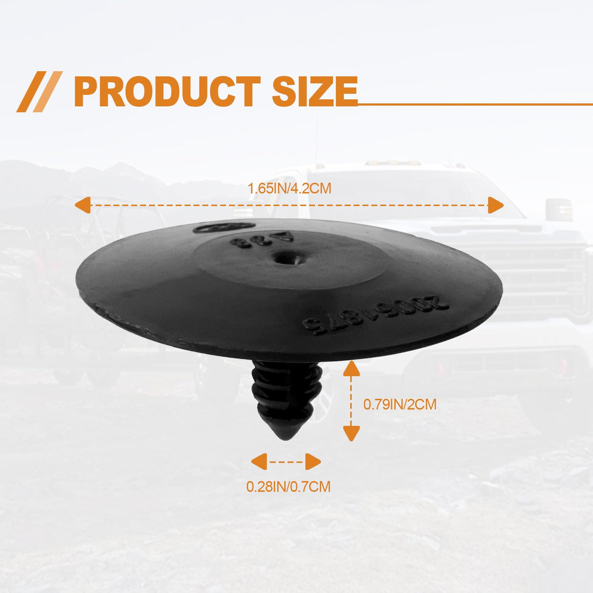 Q: What is the size and material of these insulation clips?A: These insulation clips are made from durable black nylon, ensuring longevity and reliability. The head diameter is 2 inches, stem diameter is 5/16 inches, stem length is 3/4 inches, overall length is 25/32 inches, and hole size is 1/4 inch.