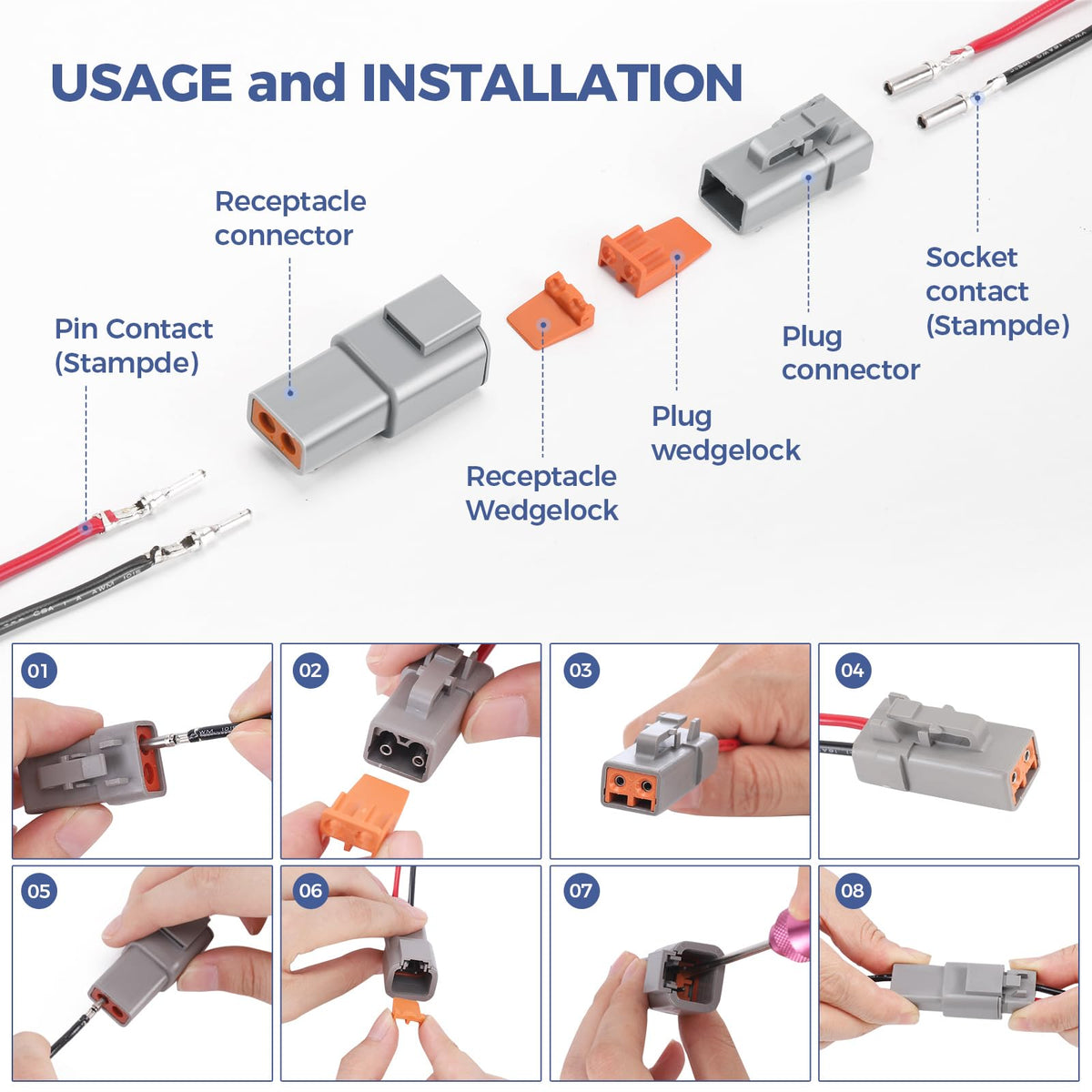 Q: What type of wire gauge is compatible with the Deutsch DTP Connector Kit?A: The Deutsch DTP Connector Kit is designed for use with wire sizes ranging from 12 to 14 AWG, making it suitable for a variety of electrical applications.