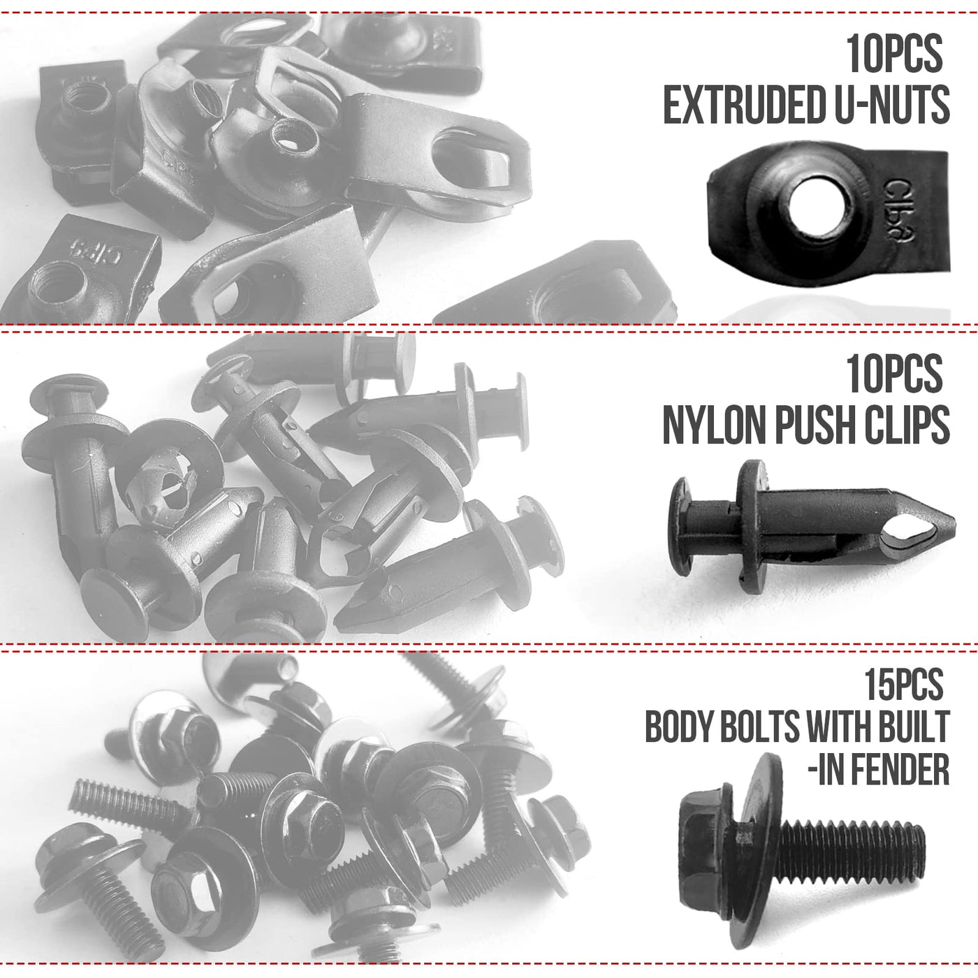 Q: How many pieces are included in this kit, and what does it consist of?A: The kit includes a total of 35 pieces: 15 bolts and screws, 10 U-nuts, and 10 bumper clips, providing a comprehensive solution for your automotive needs.