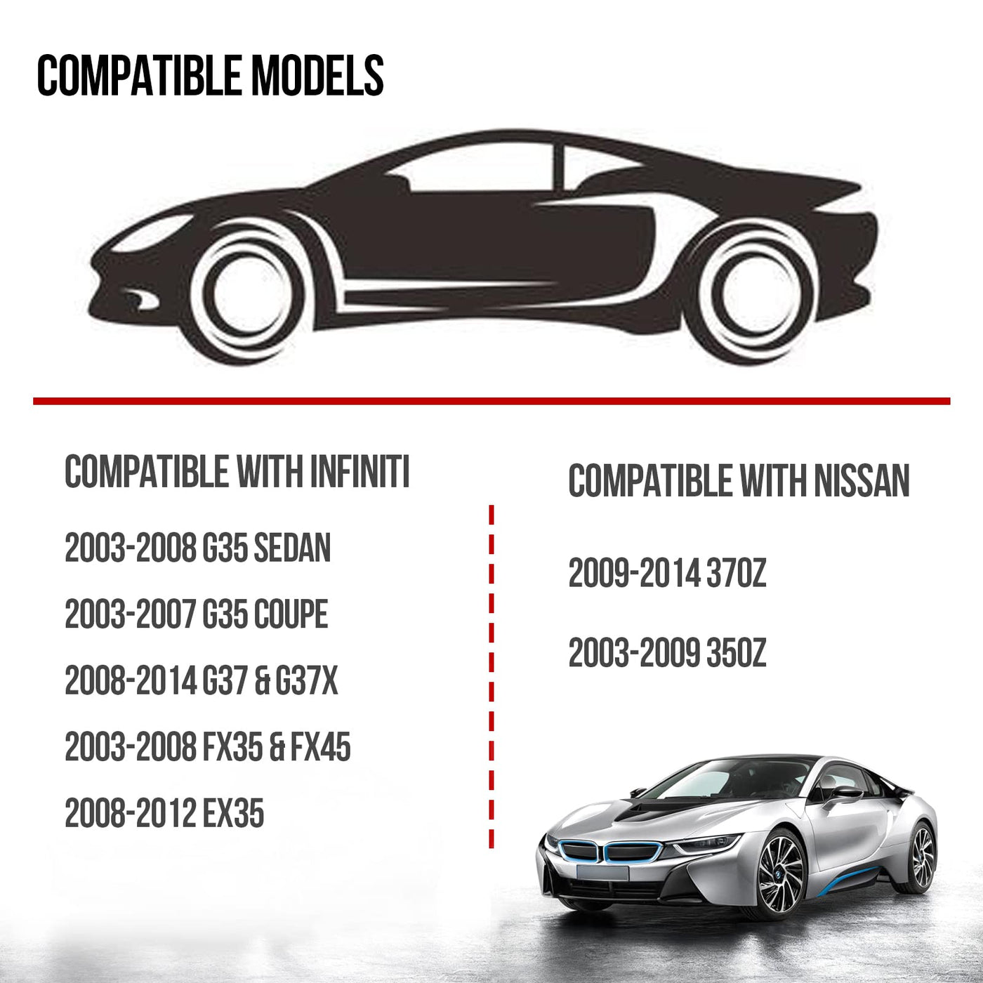 Q: What vehicles are compatible with the 35Pcs Engine Under Cover Splash Shield Body Bolts Screws Kit?A: This kit is compatible with a variety of vehicles, including the Infiniti G35 Sedan (2003-2008), G35 Coupe (2003-2007), G37 & G37X (2008-2014), FX35 & FX45 (2003-2008), EX35 (2008-2012), as well as the Nissan 370Z (2009-2014) and 350Z (2003-2009).
