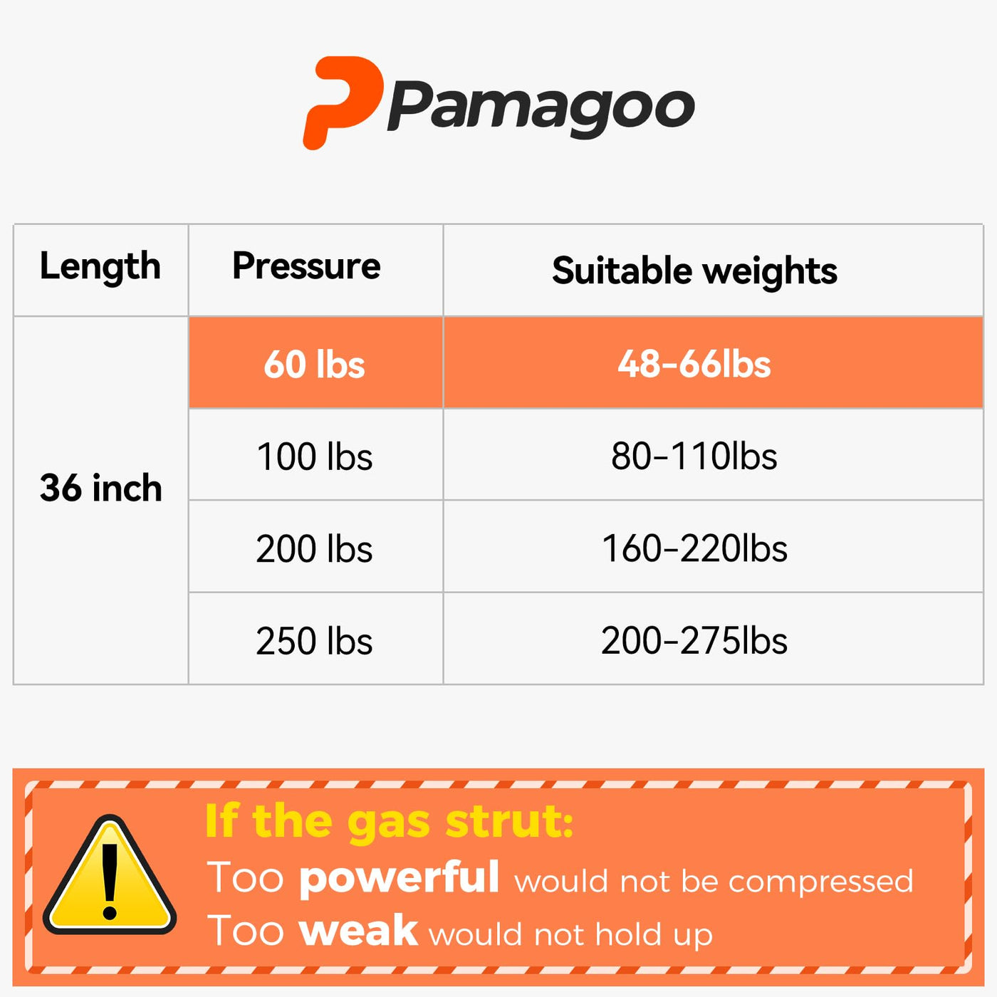 Pamagoo 36 Inch Gas Strut 60 Lbs 267 N Per Shock, 36'' Gas Spring Lift Support For Rv Bed Door/Lid Toolbox/Heavy-Duty Kitchen Door/Basement Storage Door/Camper Rear Window/Pickup Topper Cover.Interchange.Please Choose The Appropriate Model Or Measure The Size And Weight Of Your Item . The Gas Struts Can Not Be Compressed By Hands Before Installation!!!Pamagoo Will Provide You With Professional Customer Service Both And Offer 18-Months Support Service. We Have Installation Videos And Online Service To Guide Quick Installation In Minutes.