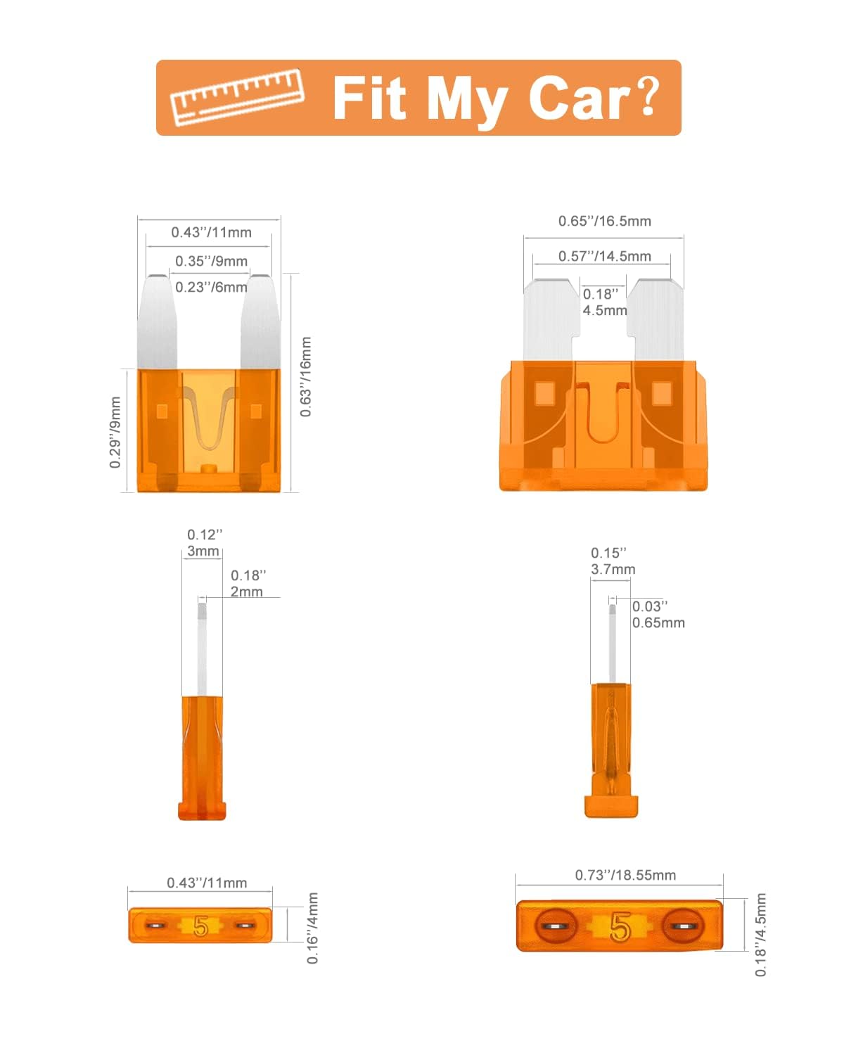Q: What types of fuses are included in the 360pcs Car Blade Fuses Assortment Kit?A: The kit includes a total of 360 fuses, comprising 150 standard fuses with ratings of 2A, 3A, 5A, 7.5A, 10A, 15A, 20A, 25A, 30A, and 35A, and 210 mini fuses with the same ratings, ensuring you have a wide range of options for various automotive applications.