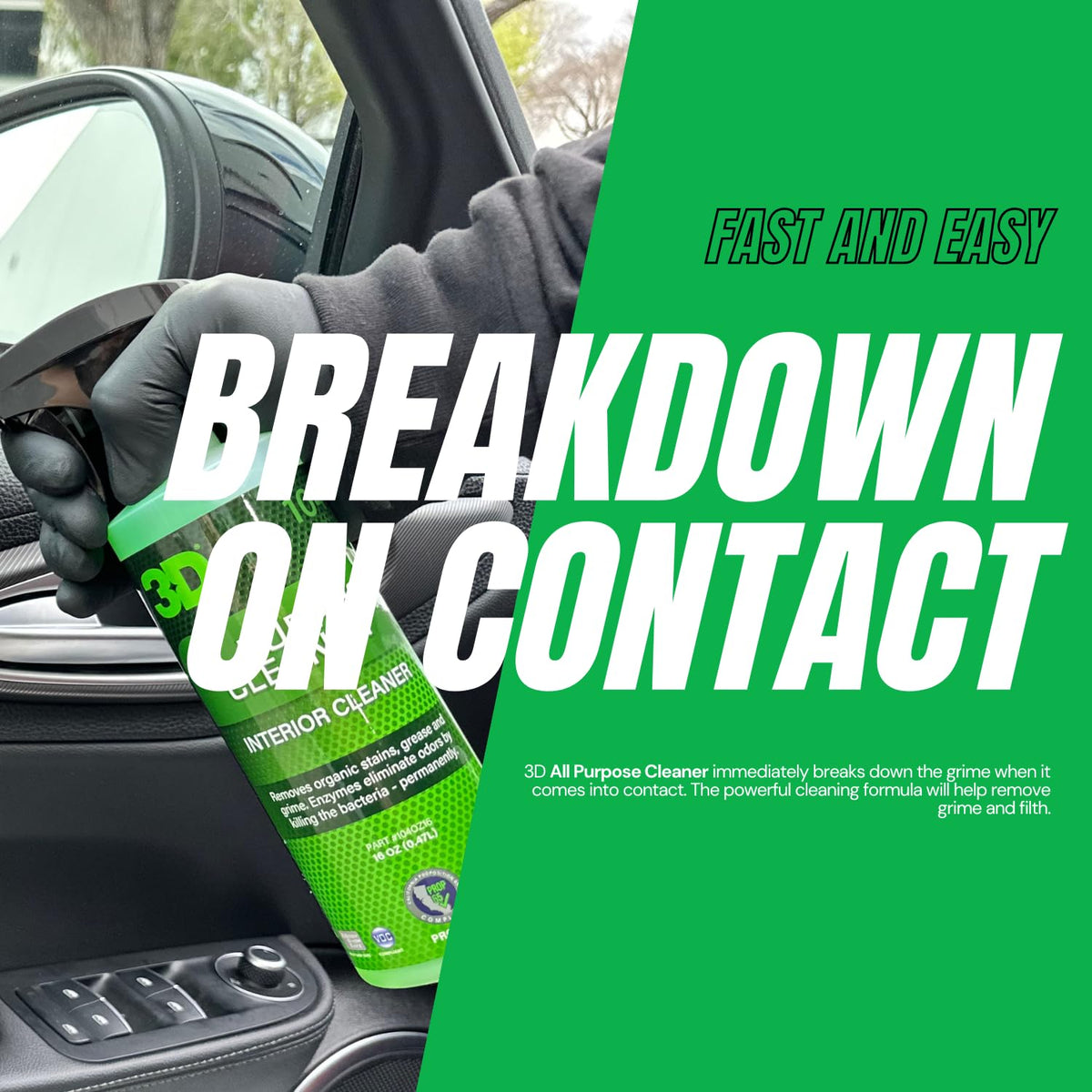 3D All Purpose Cleaner Is An Interior And Exterior Automotive Surface Cleaner.It Is Highly Effective For Vinyl Tops, Carpets And Upholstery. It Is Safe On All Surfaces And 100% Biodegradable. We Use Green, Organic, Or Natural Ingredients Whenever Possible. Excellent Pre-Spotter Before Washing Car Interior. This Product Is Also Excellent To Clean Dirty Leather Interior. Works Great For Automobile, Boat And Home.
