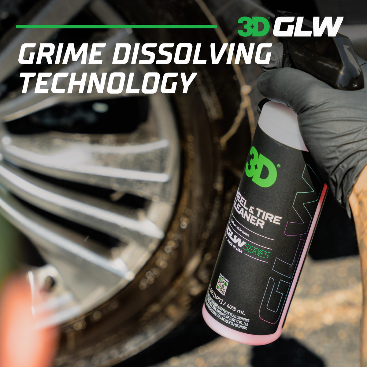 Restore your wheels and tires to factory-fresh with 3D GLW Series Wheel & Tire Cleaner. This all-in-one cleaner cuts through brake dust, tire browning, road grime, and greasy build-up in just minutes. The high-performance formula is safe for all wheel finishes, including painted, polished, and chrome. Its tough on dirt but gentle on your investment. Just spray it on, agitate with a brush or sponge, and rinse off to reveal a like-new look. Ideal for pre-detail prep, this cleaner gets your wheels and tires ready for dressing or protection. Made in the USA, its DIY friendly, pro trusted, and part of the next-level GLW Series system. Clean, shine, repeat.