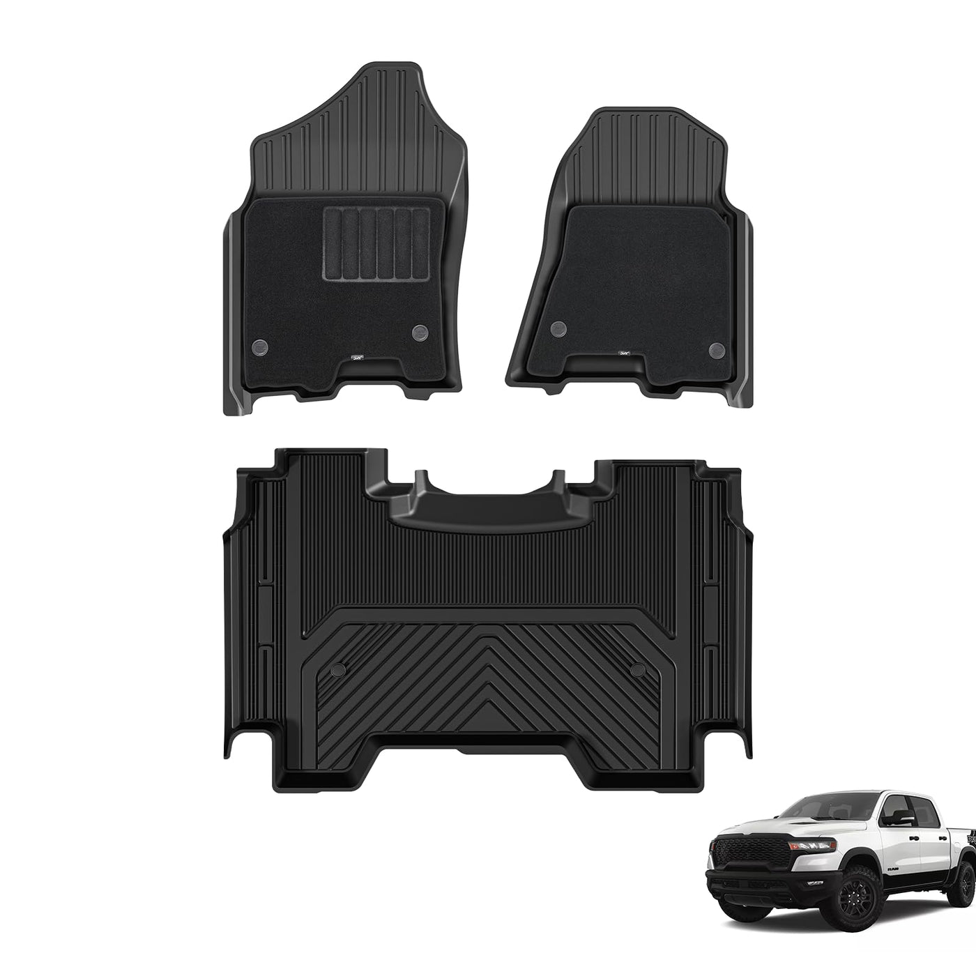 3W Floor Mats & Front Carpet Top For Dodge Ram 1500 2019-2024 (New Body Crew Cab/Without Storage) 1St & 2Nd Row Tpe All Weather