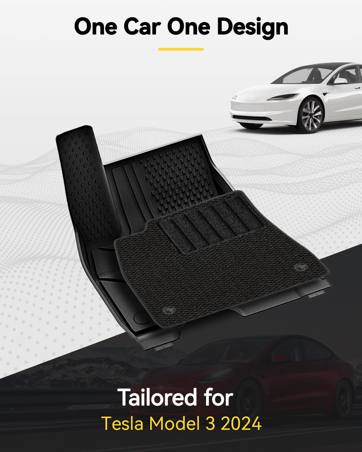 3W Floor Mats With Carpets For Tesla Model 3 2024 Trunk Cargo Liner, All-Weather Tpe Full Set Floor Liners And Cargo Liner Mats