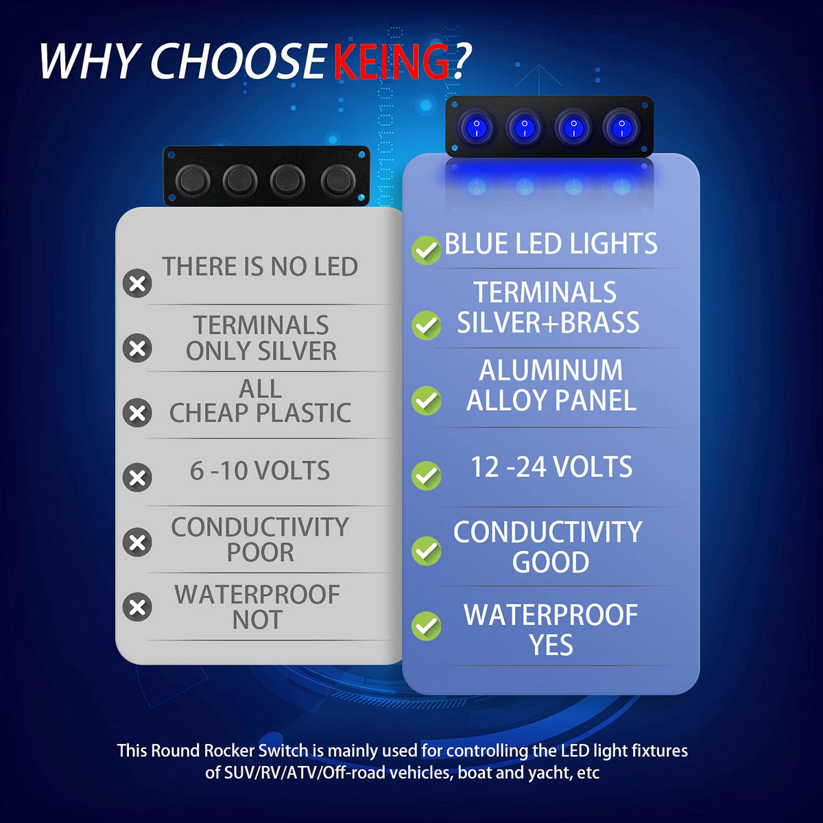 100% BRAND NEW Item ! Never Used !! KEING Guarantee: >>> We take ''the customer's satisfaction first'' as our principle and offer ''FIVE YEARS'' warranty on item (s) damaged during delivery or have a confirmed manufacturer defect. >>> Designed for applications where space is at a premium. Technical Specifications: ? Certifications: CE/ROHS/UL APPROVED ? Protection level: IP66 Waterproof,Totally Environment Friendly ? Switch Mode: ON-OFF ? Expected Lifespan: 100,000 Hours ? Operating Voltage Range: DC 8V-16V ? Working Temperature: -45?+175? ? Material: Made of heavy aluminum panel and anti-retardant materials and superior ABS & PC switches and well-conductive pins ? 3 Pins Switch: Safety of use, have output circuit protection, overload protection, reverse polarity protection etc. ?LED Light Color: Blue ?Type: SPST (Single pole single throw) ?Switch Mode: ON-OFF ?High Intensity IP66 Waterproof and Dustproof ?Voltage/Amperage rating: 12V 20A DC (6 Amp 250 VAC and 10 Amp 125 VAC) ?Suitable for 0.8''/20mm mounting hole ? Warranty: 5 Years Package Include: 1x Pre-wired Multi-Functions 4 Gang Switch Panel 4x screws