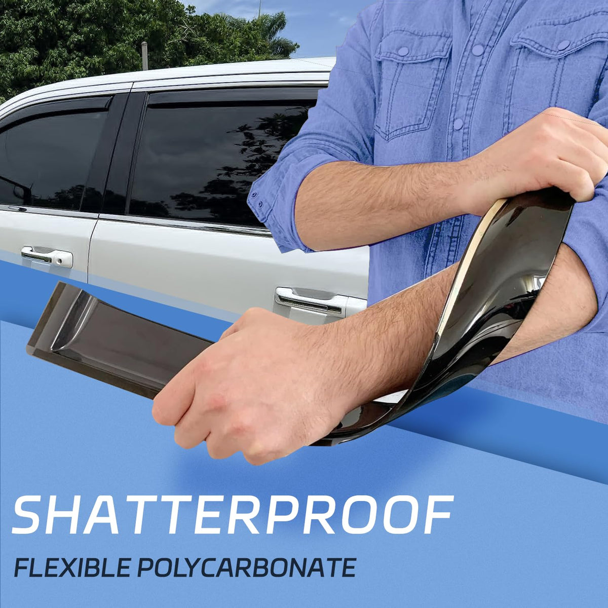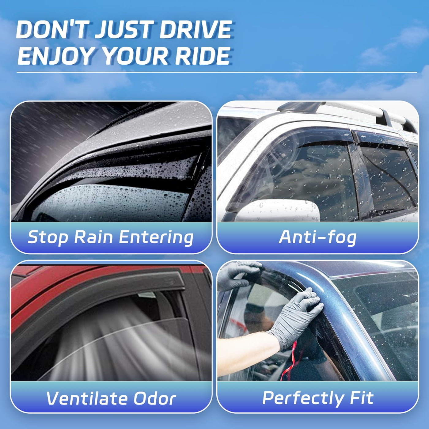 CHYKORLA side window visors fit for 1999 2000 2001 2002 2003 2004 2005 2006 2007 2008 2009 2010 2011 2012 2013 2014 2015 2016 Ford F250 F350 F450 F550 Super Duty 4 full size doors. Rain guards for truck window construct with high-grade impact-resistant acrylic thats scratch resistant, car wash safe, and will never fade or discolor from exposure to the sun. You could enjoy the fresh air and keep the rain drops out after installing the vent visors window shade and keeping the window cracked open, no foggy worries.