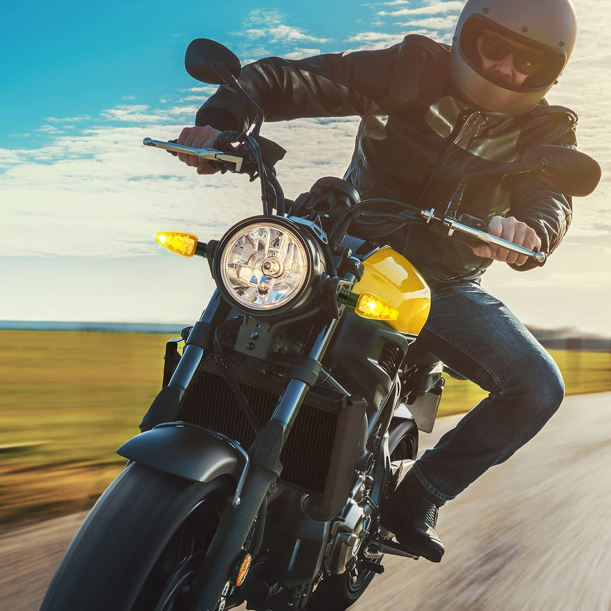 Q: What is the brightness level of the LED lights in these indicators?A: The motorcycle signal lights feature 14 ultra-high-brightness amber LED lights, designed to enhance visibility and safety, especially when riding at night.
