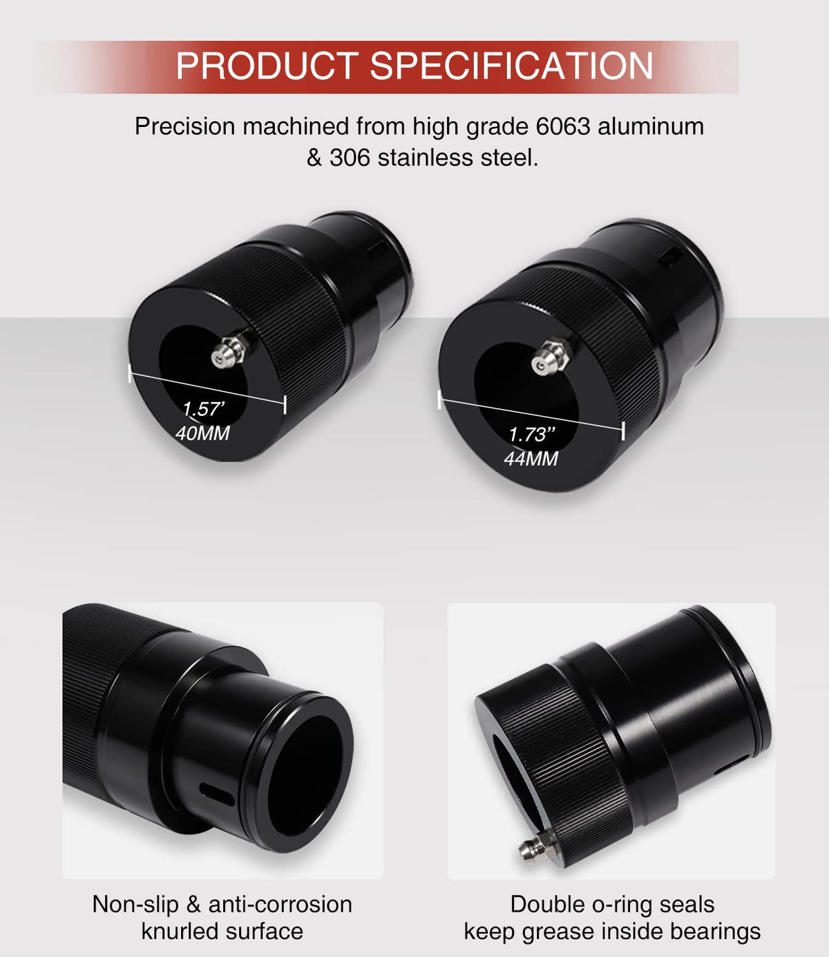 Q: What materials is the Wheel Bearing Greaser Tool made from?A: The Wheel Bearing Greaser Tool is precision machined from high-grade 6063 aluminum and 306 stainless steel. These materials provide great strength and durability, while the knurled surface with a dense oxide film and black coating ensures a non-slip grip and corrosion resistance.