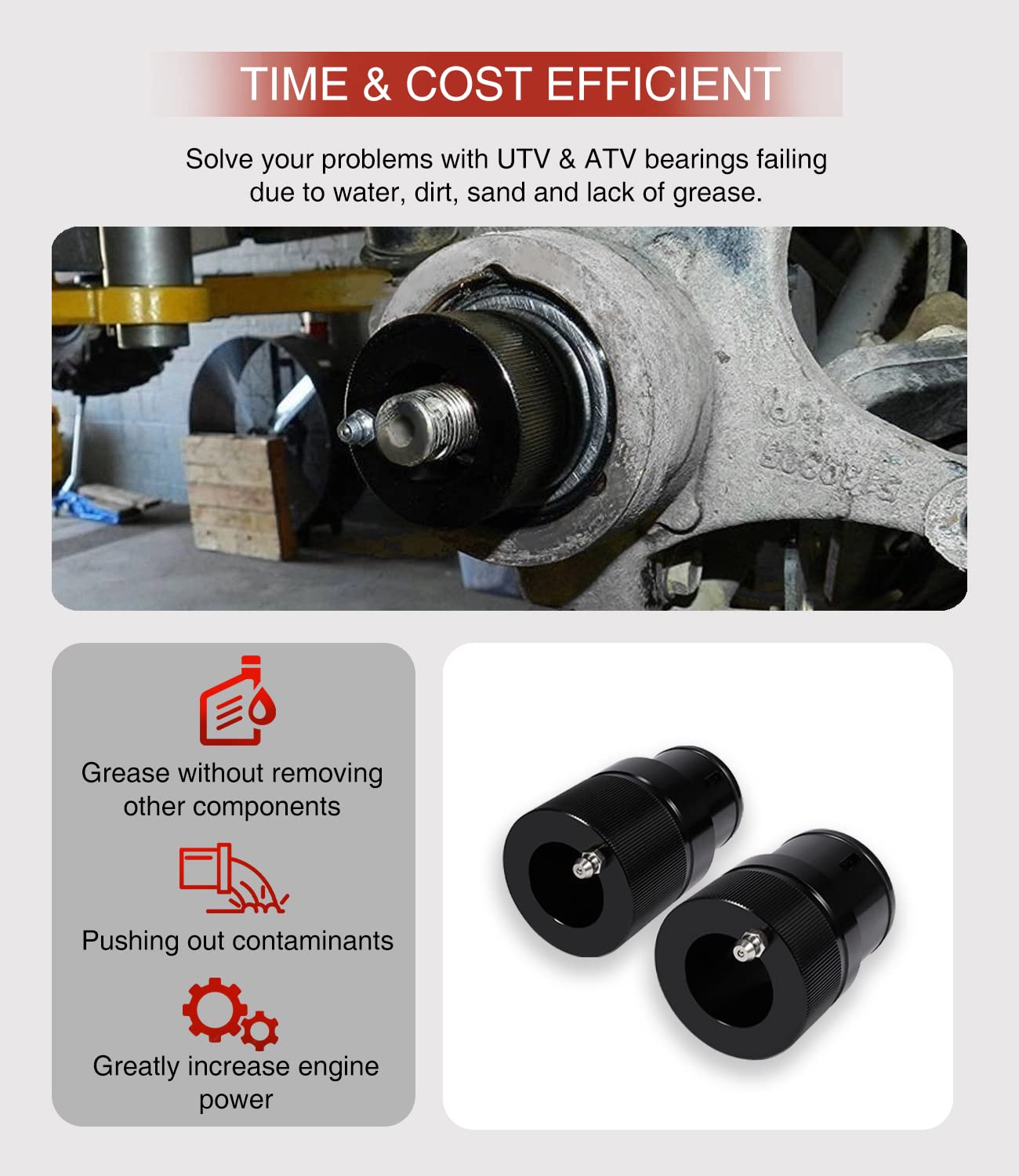 Q: How does the Wheel Bearing Greaser Tool improve maintenance efficiency?A: This Wheel Bearing Greaser Tool allows you to grease bearings without the need to remove the axle or suspension components, saving you time and effort during maintenance. It helps replenish your bearings with fresh grease while pushing out contaminants, which can prolong the life of your bearings and improve overall engine performance.