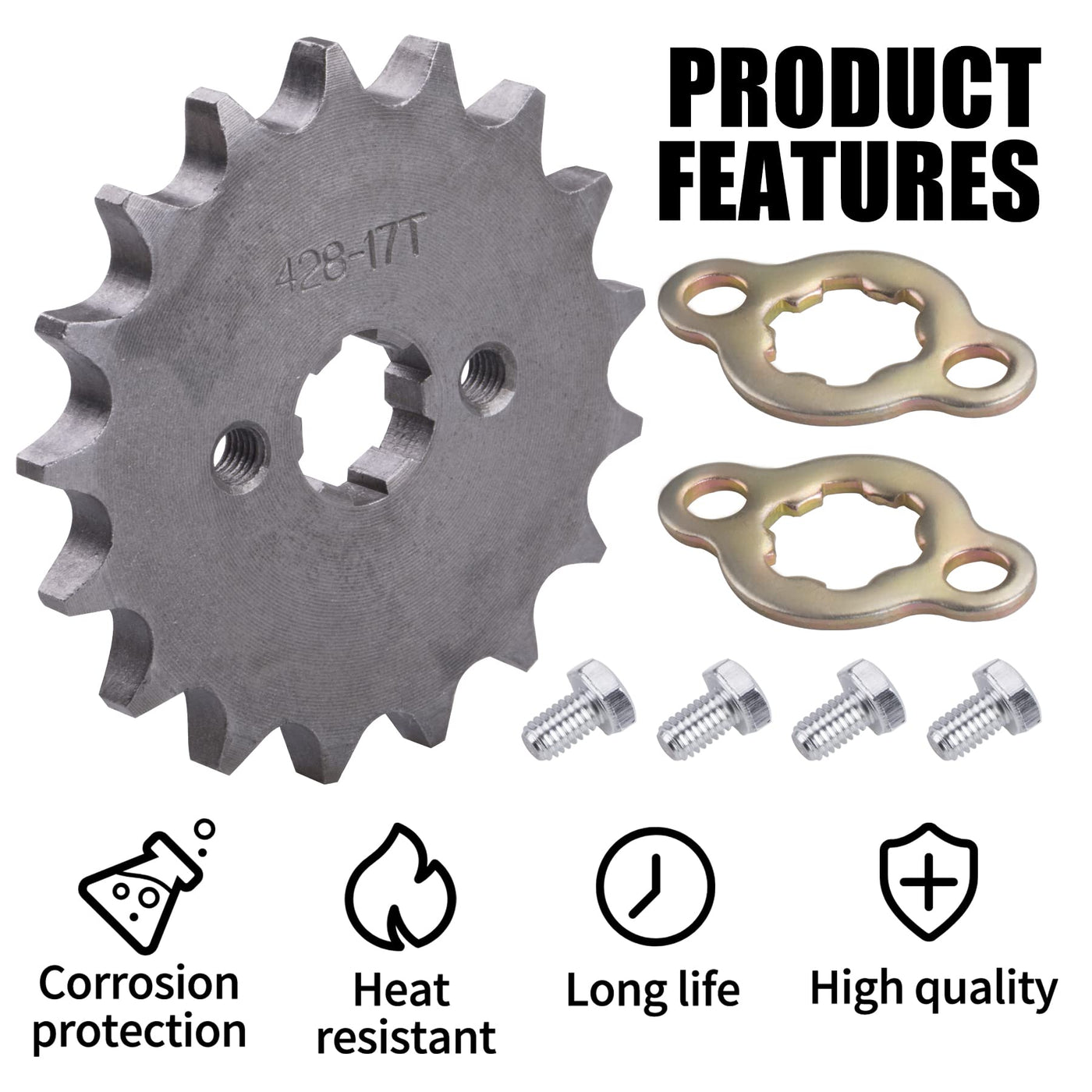 Q: What is the tooth count and inner hole shaft size of this sprocket?A: This sprocket features a tooth count of 17 teeth and an inner hole shaft size of 17mm, making it suitable for various off-road vehicles with similar specifications.