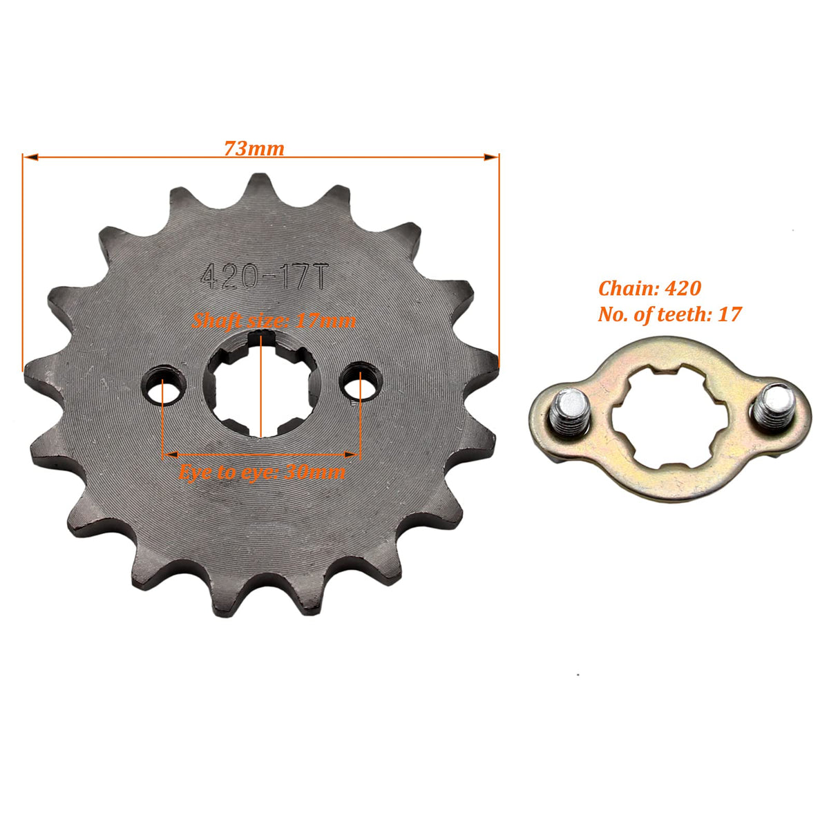 Q: What sizes of bikes is the 420 17T 17mm Chain Front Sprocket compatible with?A: The 420 17T 17mm Chain Front Sprocket is compatible with most Chinese made 70cc, 110cc, and 125cc pit dirt bikes and ATVs. Brands such as SunL, JCL, ROKETA, KingRoad, SSR, and SDG are commonly compatible.