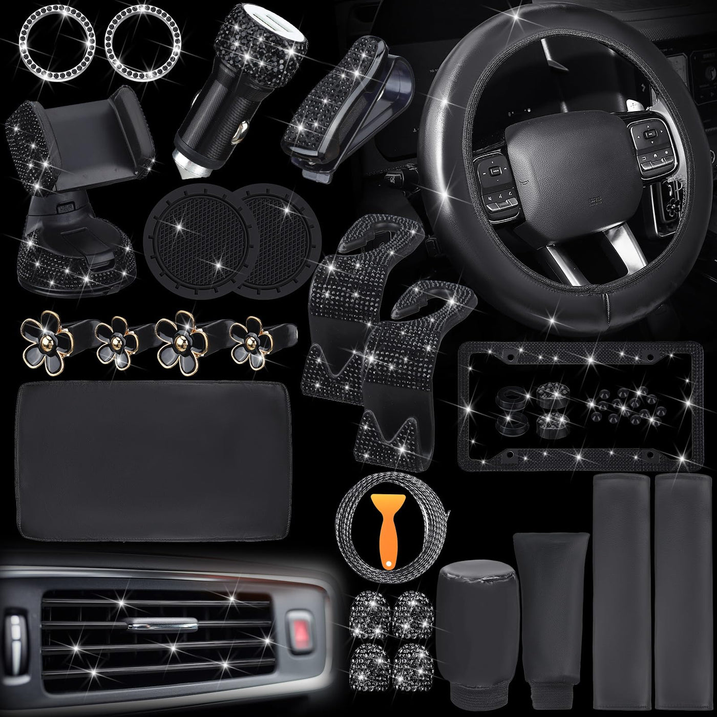 46 Pcs Bling Car Accessories Set for Women Leather Steering Wheel Cover Seat Belt Covers Diamond Rings Sticker Rhinestone Cup Ho