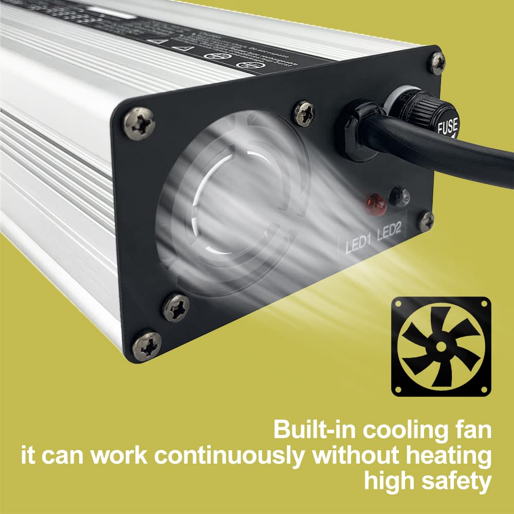 Q: What safety features does the DUDHOIK charger have?A: This charger is equipped with multiple safety features, including over current, over voltage, over temperature, short circuit, and reverse polarity protections. It also has a built-in cooling fan to prevent overheating.