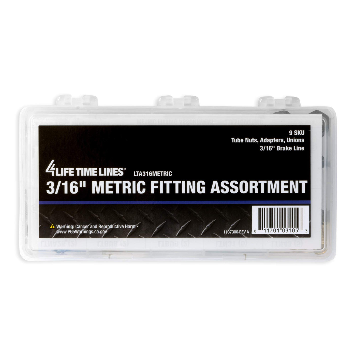 Elevate your car's performance with the 3/16'' Metric Fitting Assortment | 9 SKU, offering top-notch components your vehicle deserves. This assortment encompasses nine of the industry's most sought-after metric fittings, including tube nuts, unions, and adapters specially crafted for Japanese and European vehicle braking systems. Tailored for both specialized and general repair establishments, each fitting assortment features a curated selection of high-demand fittings indispensable for mechanics working on automotive hydraulic braking systems. This comprehensive set includes: 3/8'' Inverted / M10x1.0 Bubble Adapters (2) M10x1.0 Bubble Union LTBU8 (2) M10x1.0 Inverted Unions (2) M10x1.0 Inverted Flare Nuts (5) M13x1.5 Bubble Flare Nuts (5) M12x1.0 Bubble Flare Nuts (5) M11x1.5 Bubble Flare Nuts (5) M10x1.0 Bubble Flare Nuts (5) 3/8-24 Inverted Flare x M10.10 Inverted Flare Adapters (5) Every component is meticulously engineered using premium materials to ensure enduring repairs, guaranteeing your braking systems remain in pristine condition without concerns about premature replacements or additional fixes. For added convenience, these assortments are thoughtfully arranged and encased in durable, transparent plastic trays that simplify part identification. Labels within the packaging expedite the retrieval of the required components and facilitate easy restocking, allowing you to discern which parts need replenishing at a glance. Rest assured that 4Lifetime is unwavering in its commitment to crafting long-lasting, quality products, as evidenced by their comprehensive lifetime warranty coverage. Your purchase is safeguarded, underscoring 4LifetimeLines' dedication to providing you with the highest caliber auto parts. Opt for excellence in your automotive repairs by investing in this metric fitting assortment today. Utilize these premium components to ensure your vehicles remain in impeccable condition for an extended period. For all your braking system needs, don't hesitate to place your order for the 3/16'' Metric Fitting Assortment | 9 SKU right away.