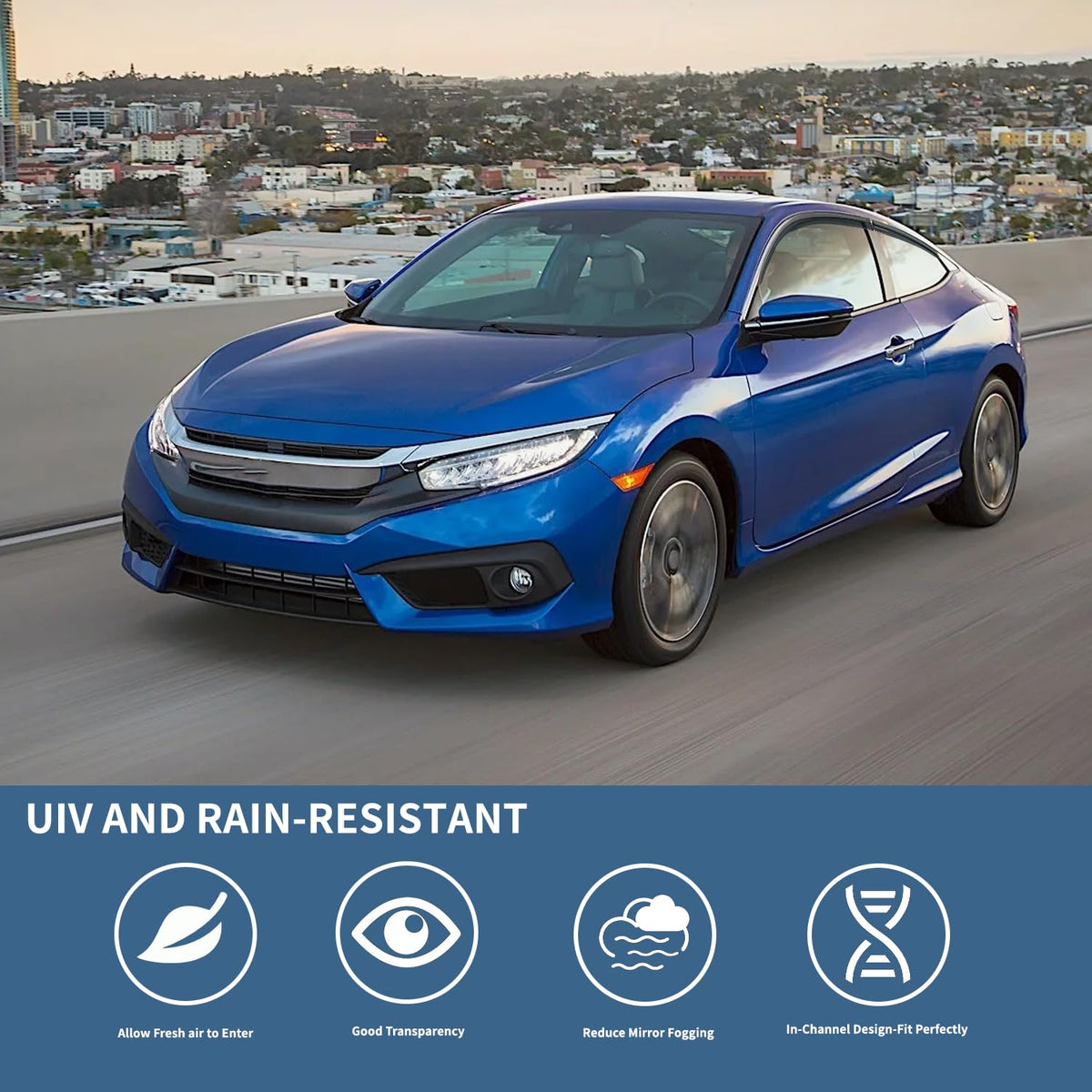 4PCS rain guards window visors Wind deflector Fits For Honda Civic 2016 2017 2018 2019 2020 2021 10th 4-Door Sedan 2017 2018 2019 2020 , 94682, Front & Rear JDM 3D Style Wavy Outside Mount Vent Shade Gifts for Christmas. The rain guards for 2016 honda civic construct with high-grade impact-resistant acrylic thats scratch resistant, car wash safe, and will never fade or discolor from exposure to the sun. You could enjoy the fresh air and keep the rain drops out after installing the vent visors window shade and keeping the window cracked open, no foggy worries.