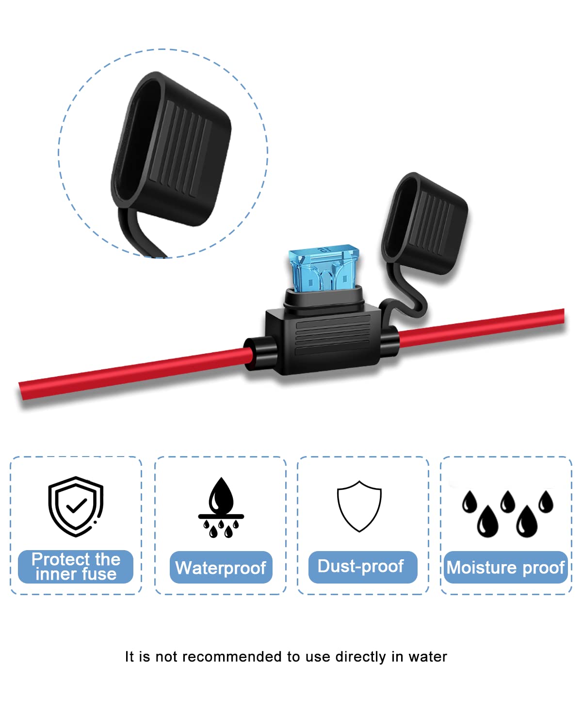 Q: Is the inline fuse holder waterproof?A: Yes, the inline fuse holder features a cap that protects the fuse inside, effectively preventing dust, moisture, and water from damaging the fuse. This waterproof design enhances its reliability in various environments.