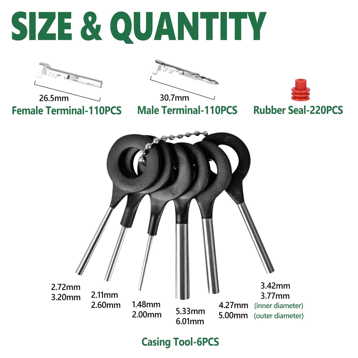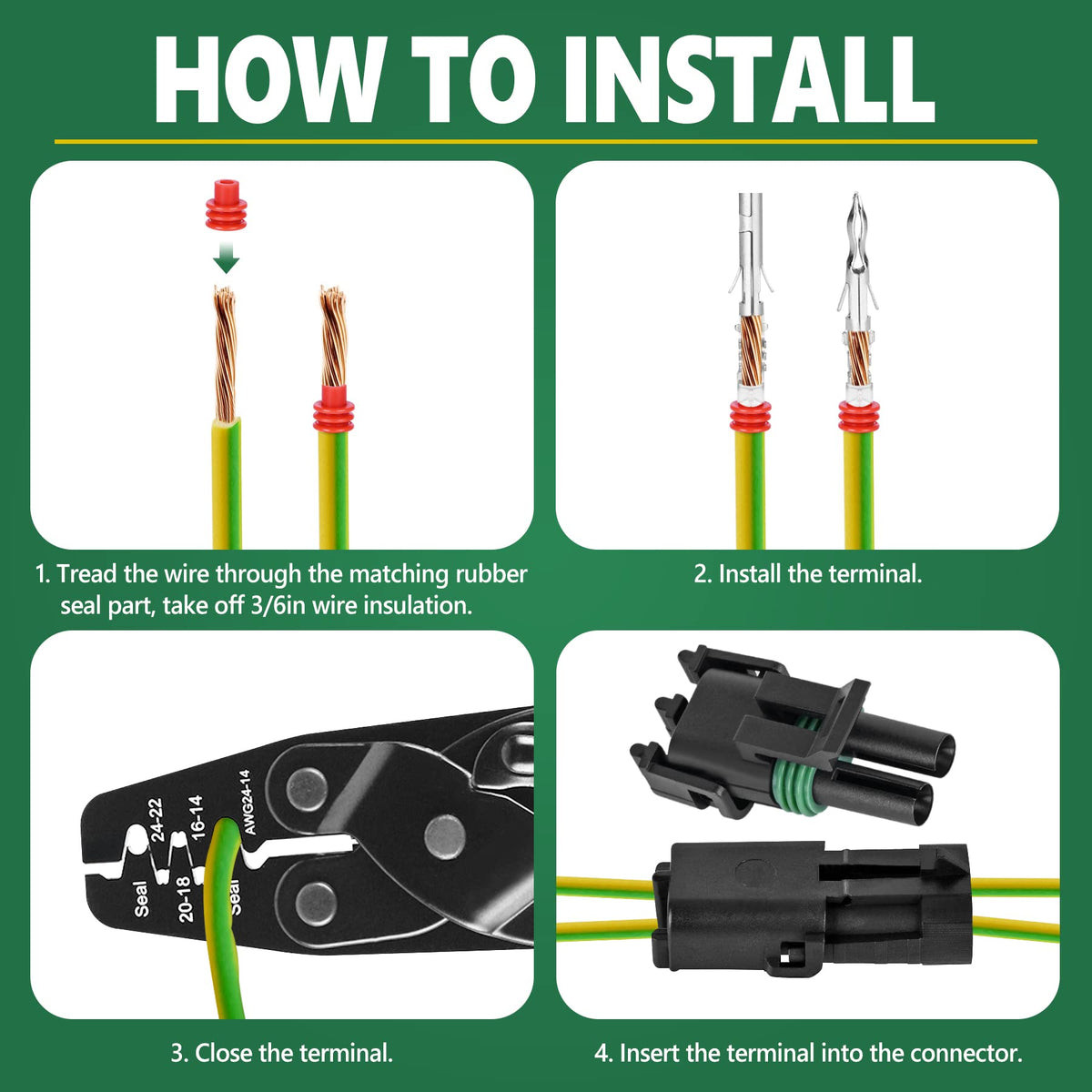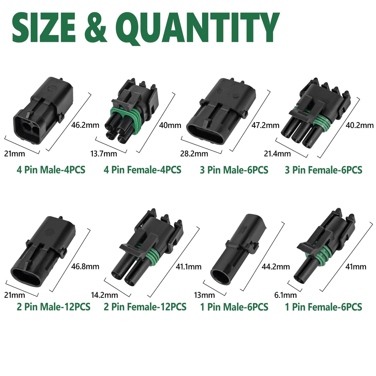 Each storage box contains 502pcs/28kits 1/2/3/4 Pin connector. Wire plug connectors kit includes 6pcs x 1 Pin male/female plugs, 12pcs x 2 Pin male/female plugs, 6pcs x 3 Pin male/female plugs, 4pcs x 4 Pin male/female plugs, 110pcs male terminal, 110pcs female terminal, 6pcs casing tool, 220pcs rubber cable seal | Perfect for various wire connectors such as motorcycles, trucks, ships, quad bikes, jet skis, scooters, automobiles, ships, etc | 22-14 AWG Waterproof Automotive Electrical Connectors, Current Rating: 1.5A to 9.5A, Operating Temperature: -40? to +125? | Easy to install under soldering and crimping. There will be a ''click'' sound when you have done the installation correctly | Automotive connector is made of PA66, which is anti-oxidation, waterproof, dustproof and has high toughness, can be bent to a certain extent and is not easy to break. The terminals are made of H62 brass with improved plug-in contact conductivity. The plug is made of silicone rubber, which is resistant to high temperature and has good elasticity