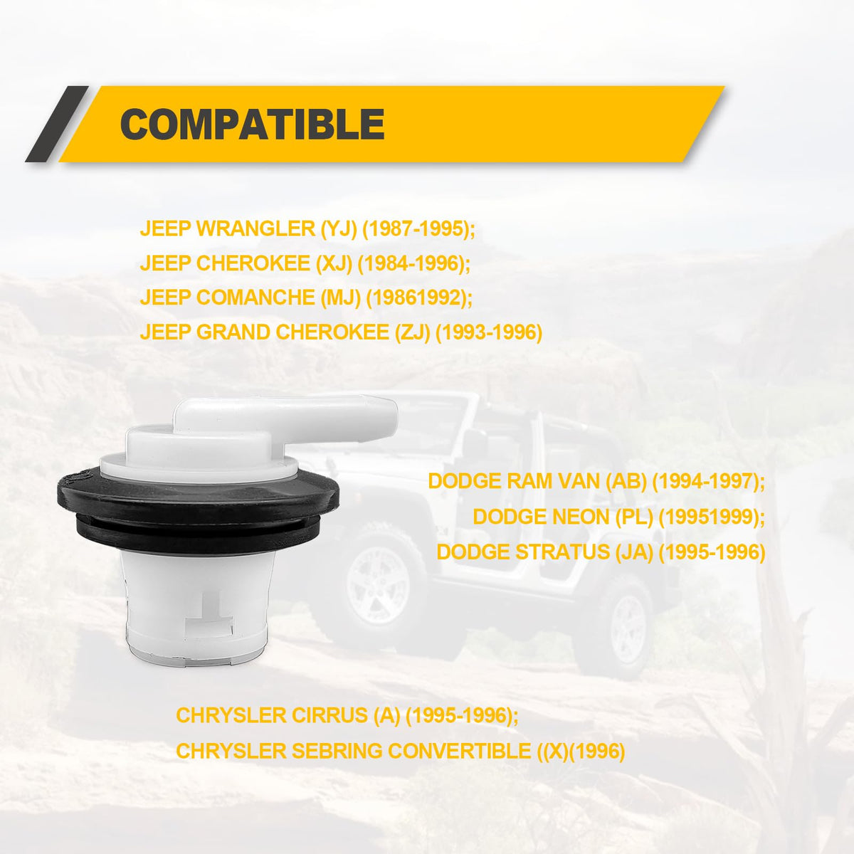 Q: What vehicles are compatible with the 911060 Fuel Tank Vent Valve?A: The 911060 Fuel Tank Vent Valve is compatible with a range of vehicles, including the 1987-1995 Jeep Wrangler (YJ), 1984-1996 Jeep Cherokee (XJ), 1986-1992 Jeep Comanche (MJ), 1993-1996 Jeep Grand Cherokee (ZJ), 1994-1997 Dodge Ram Van (AB), 1995-1999 Dodge Neon (PL), 1995-1996 Dodge Stratus (JA), 1995-1996 Chrysler Cirrus (JA), and 1996 Chrysler Sebring Convertible (JX). Please verify compatibility with your specific vehicle before purchasing.