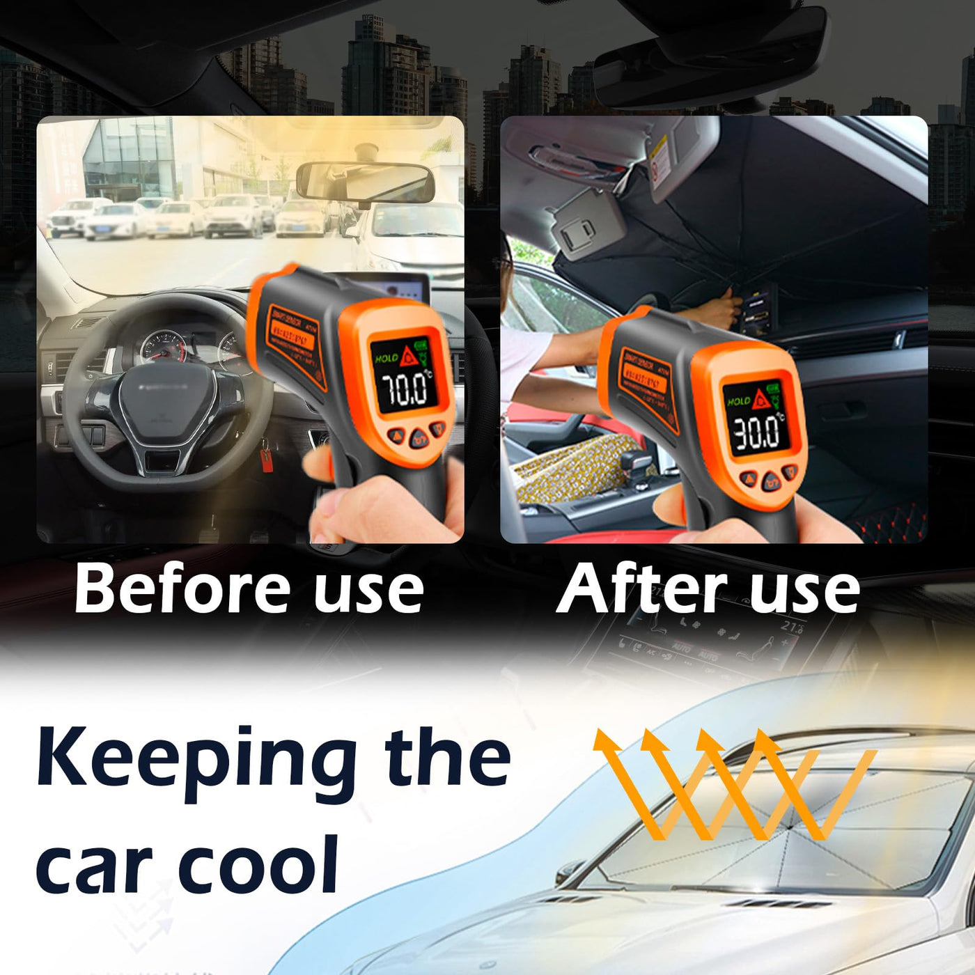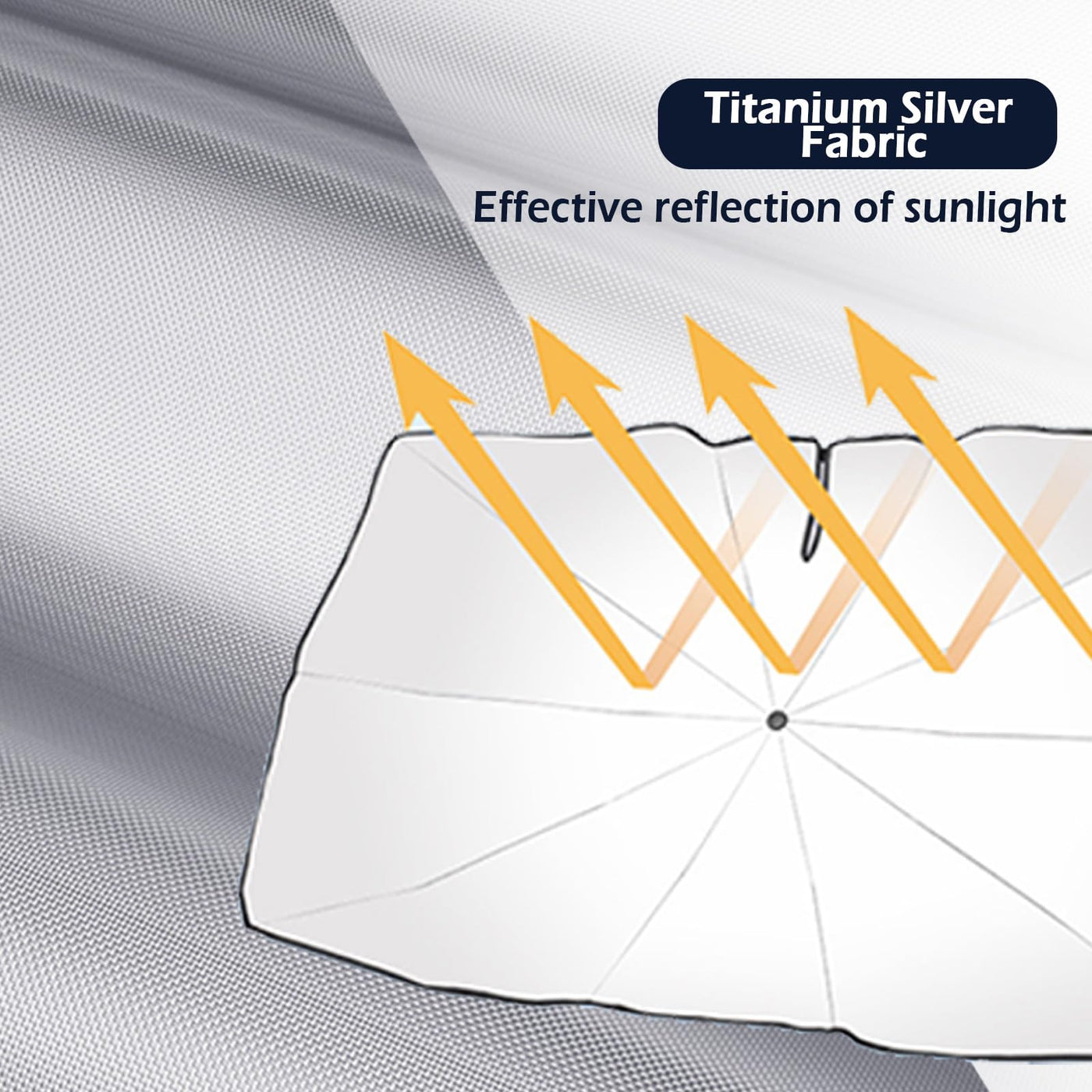 OUR CAR WINDSHIELD UMBRELLA PROVIDES YOU WITH ALL-AROUND PROTECTION FROM THE SUN, SO YOU CAN ENJOY A COOLER CAR INTERIOR ANYTIME, ANYWHEREProduct AttributesColors: SilverSizes: 55.12*30.71*0.02 inchWeight: 13.37 ozMaterial: Titanium Silver, Carbon SteelPackaging: Car Windshield Umbrella*1, Storage Bag*1Note: Our car sunshade is not suitable for some large SUVs or large trucks, please pay attention to measure the size of the windshield of your vehicle before purchasingProduct Functions & FeaturesWrapped Umbrella Beads: Traditional umbrella beads are usually exposed metal structures, our car windshield umbrella wrapped in a layer of protective material on the outside, when used will not cause scratches or injuries to the interior of the car like ordinary metal umbrella beads, to a large extent, to protect your car interiorReduce The Temperature Inside The Car: Titanium silver coating combined with 5 layers of nano thermal insulation material structure, significantly reduce the high temperature inside the car, can block 99.8% of the sunlight, refusing to car sun exposure, so that you can also feel the cool and pleasant environment in the hot summer monthsTen Umbrella Bones: The use of ten bones anti-concave umbrella bone, increasing the support point of the umbrella surface, making the entire structure of the car umbrella sun shade more stable, anti-concave design gives the umbrella bone stronger load-bearing capacityProduct Installation1. Take out the car windshield umbrella and hold it open in front of the windshield2. Flip the car visor down so that it secures the top edge of the windshield umbrella3. Then use the adhesive fastener and stick it bypassing the rear view mirror