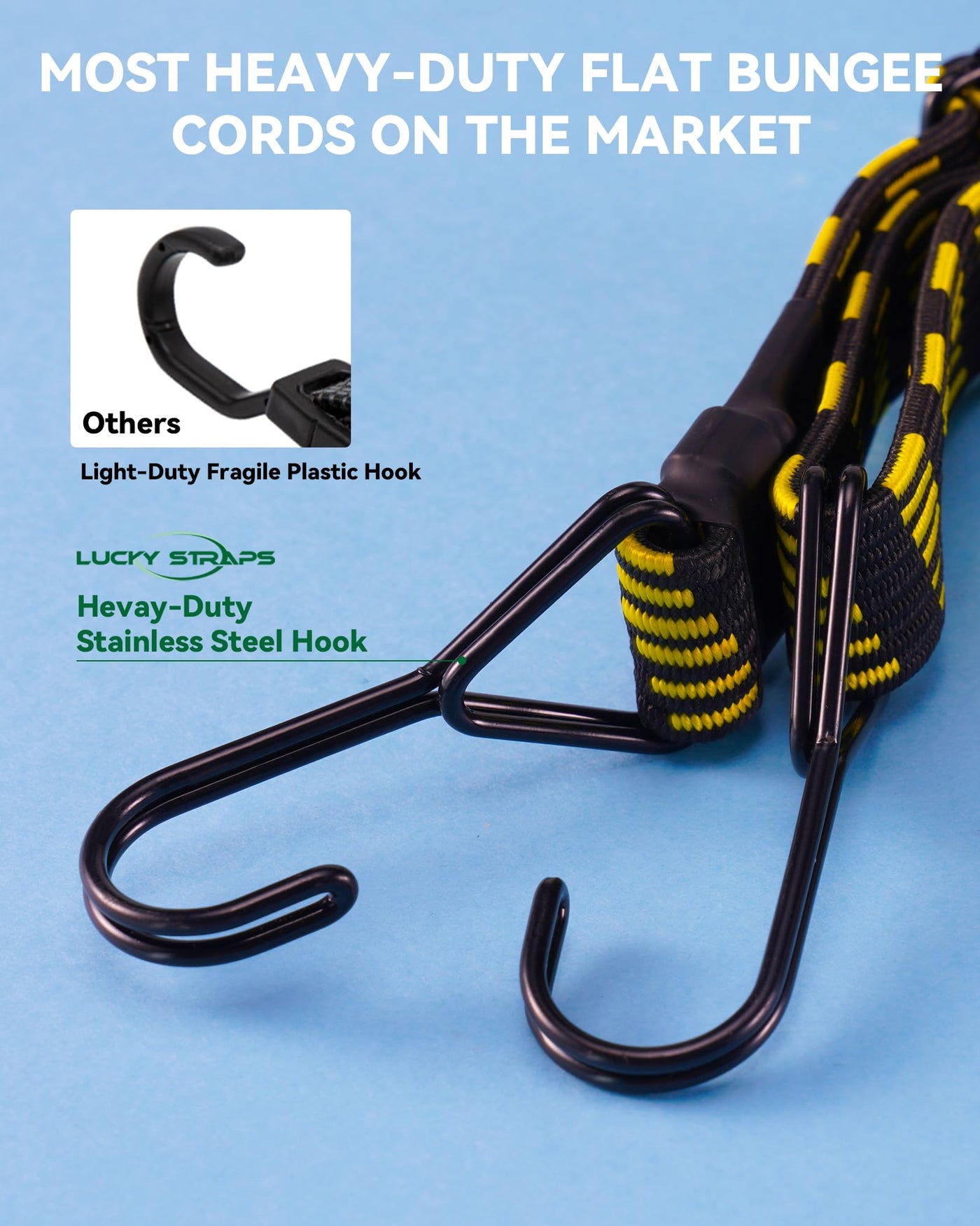 HEAVY-DUTY STAINLESS STEEL HOOK LuckyStraps flat bungee straps use heavy duty stainless steel hooks that are strong and hard to break.