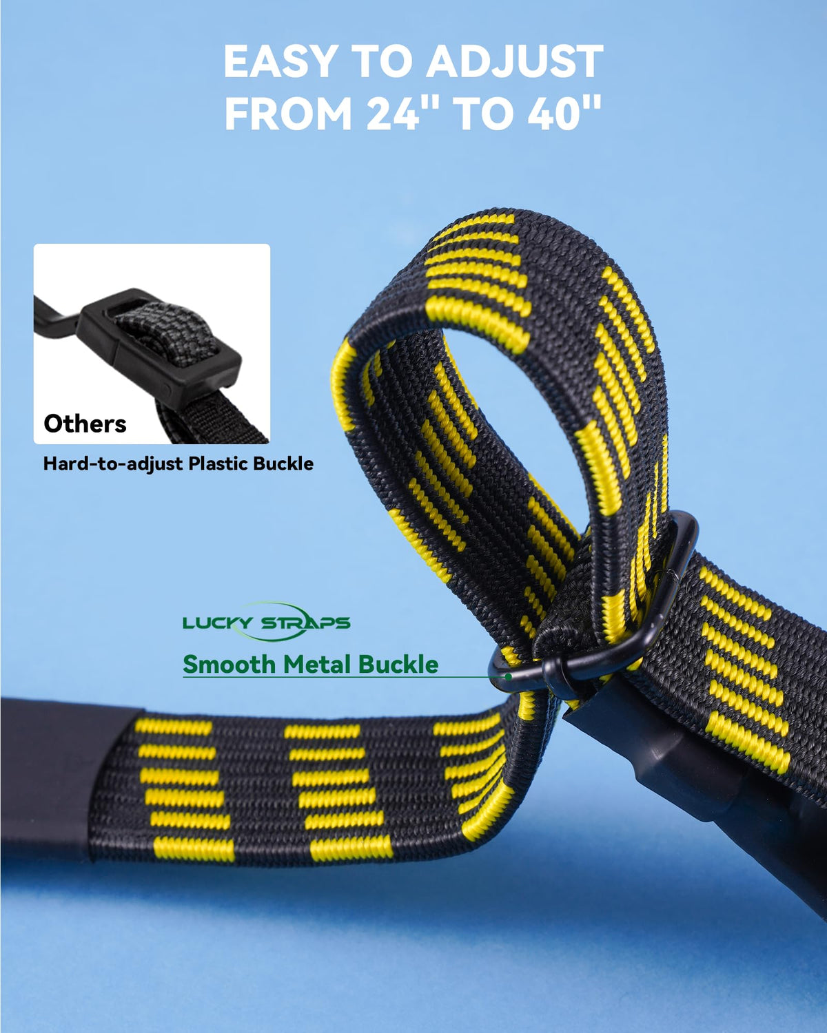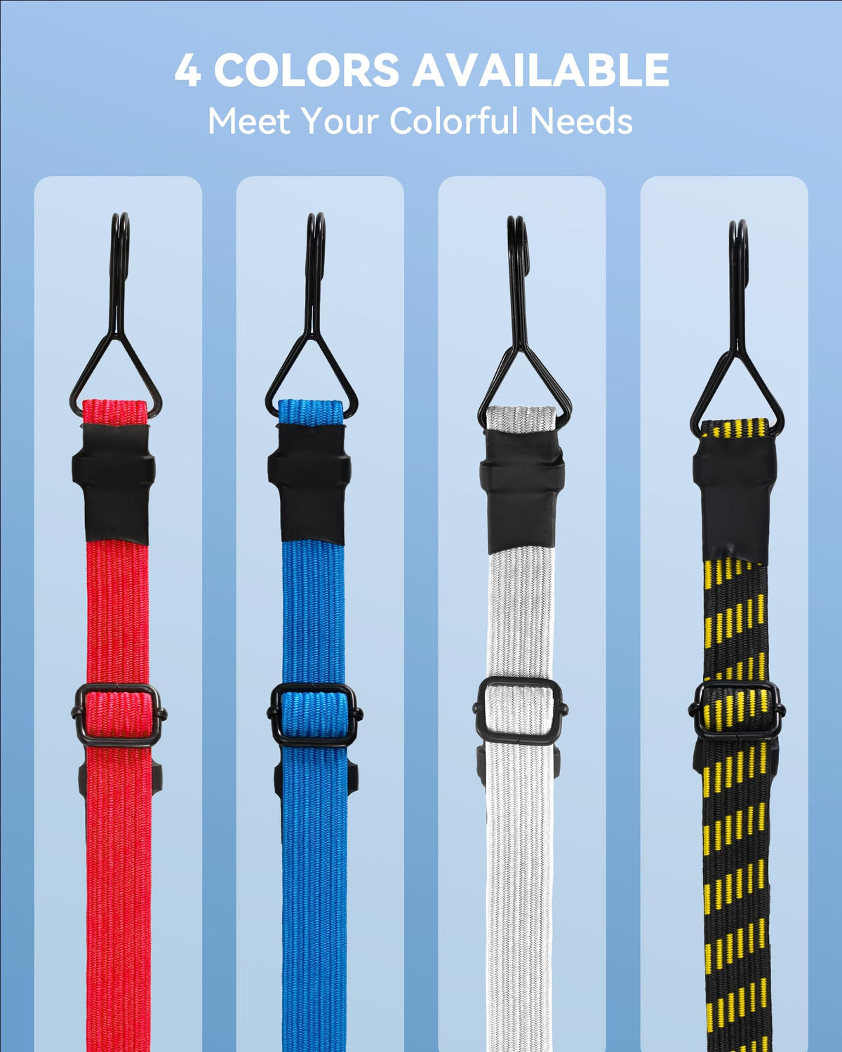 EASY TO ADJUST LuckyStraps flat bungee cords with hooks use smooth metal buckles that are easy to adjust the length.