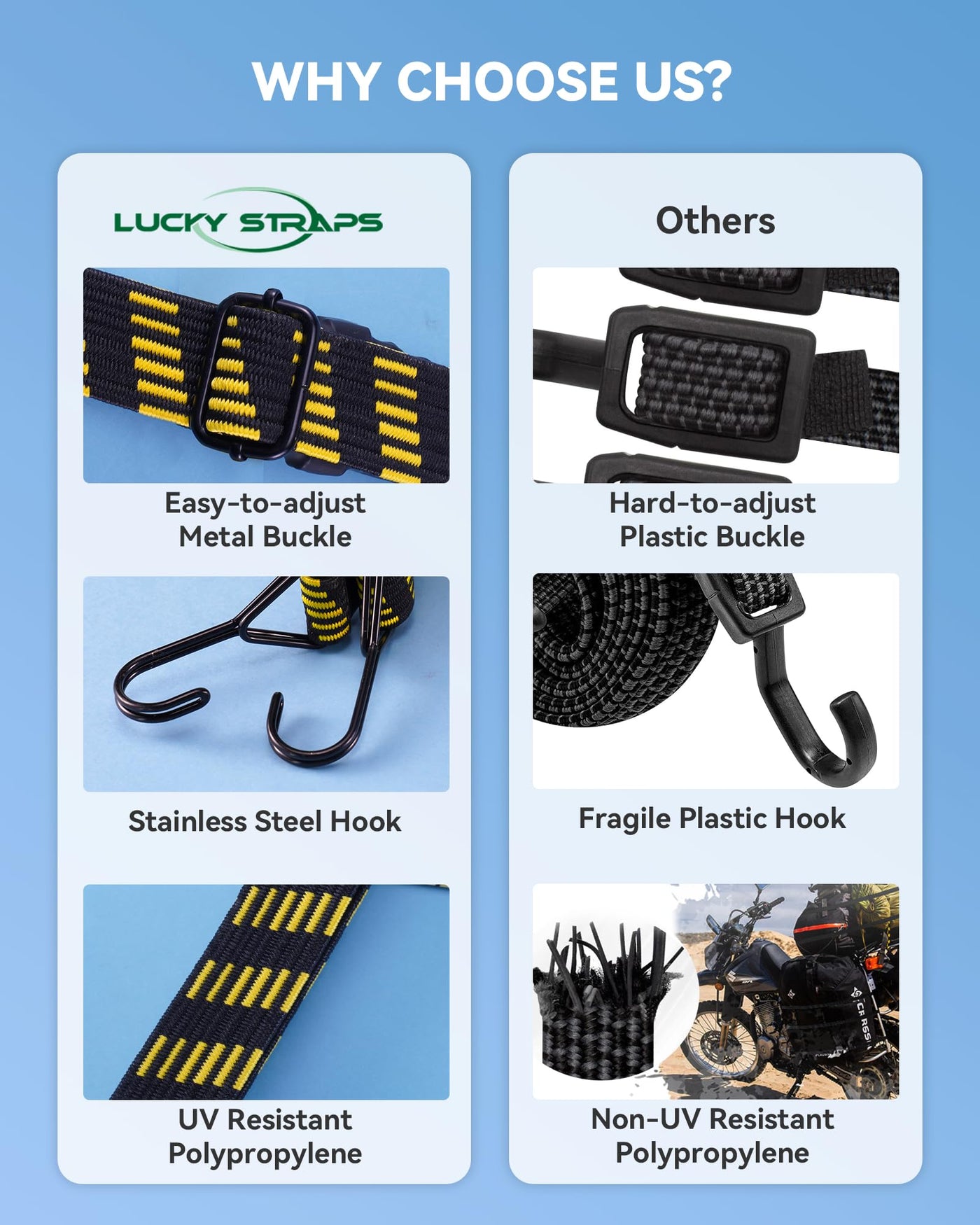 EXCELLENT UV PROTECTION The LuckyStraps flat bungee cords use high-strength and UV-resistant polypropylene yarn, which greatly extends its lifespan outdoors.