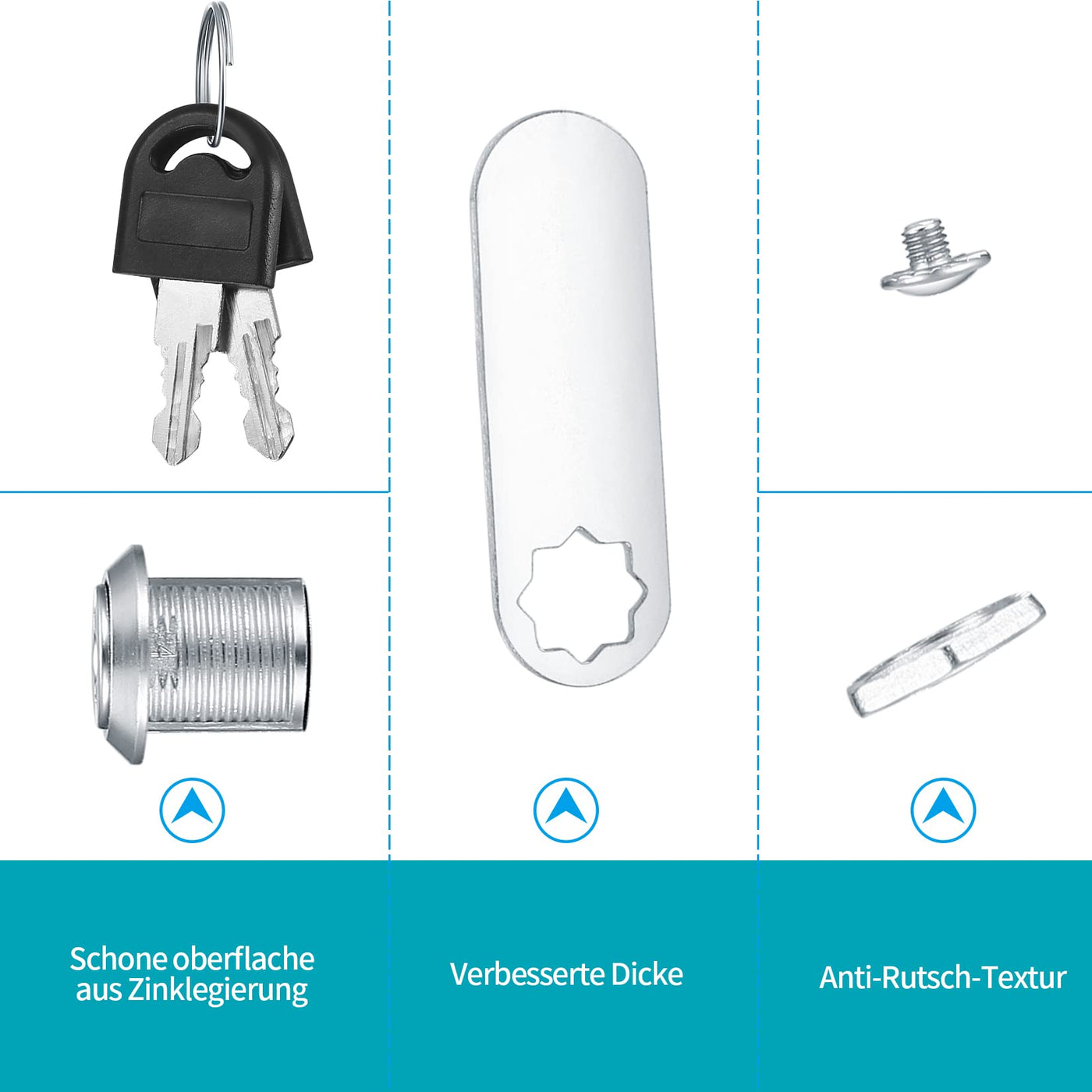 Q: What materials are used in the 6 Pieces Cam Lock?A: The 6 Pieces Cam Lock is made of high-quality zinc alloy metal, which ensures durability, corrosion resistance, and long-lasting performance.