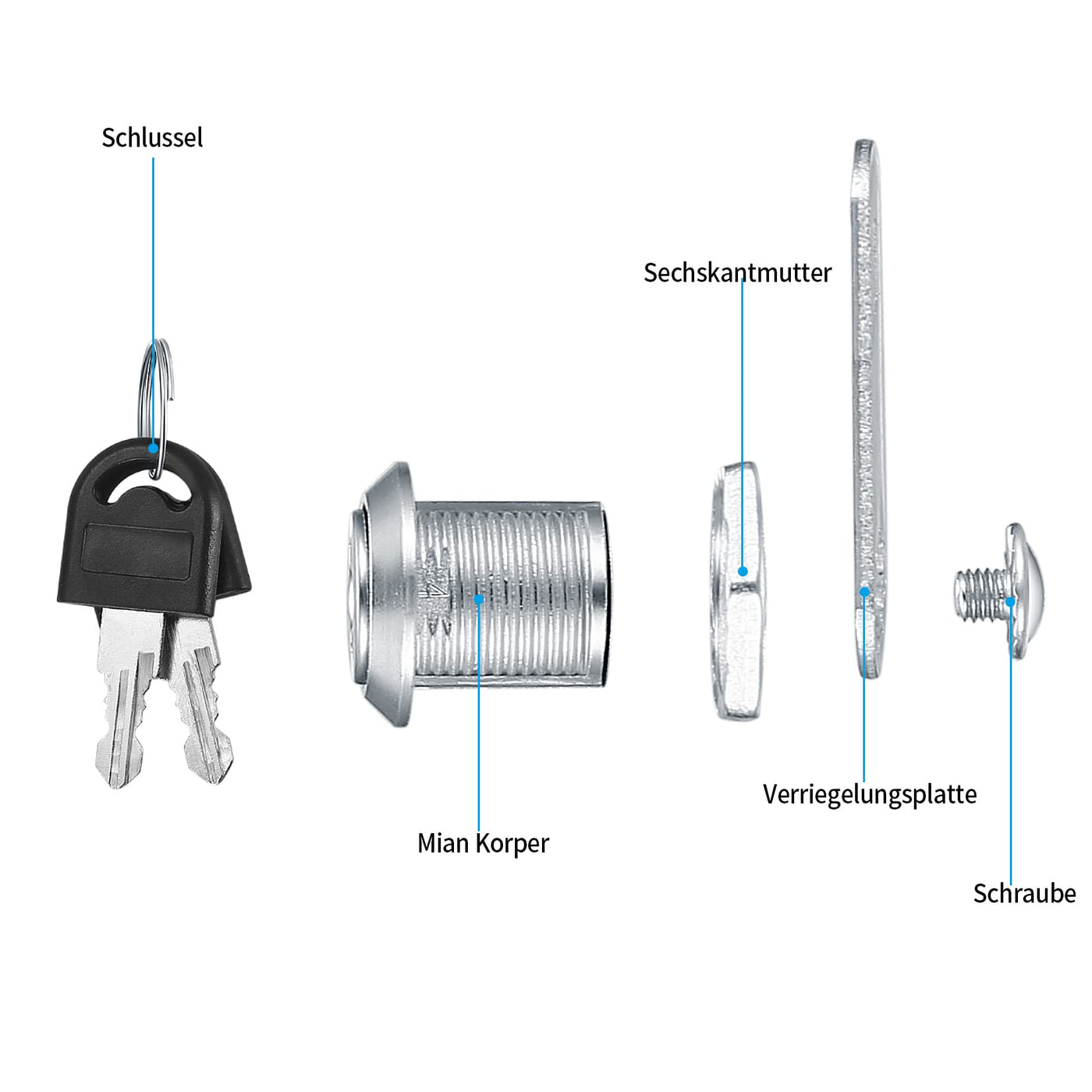 Q: How do I install the Cam Lock?A: Installation is simple: drill a hole in the desired location, insert the lock head, and secure it with the provided fixing screw. It can be installed on various surfaces including metal and wood.