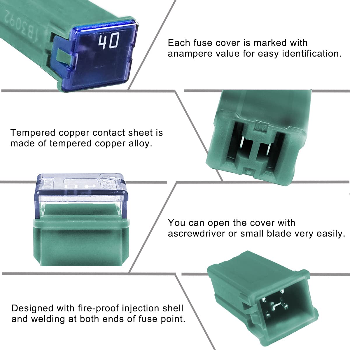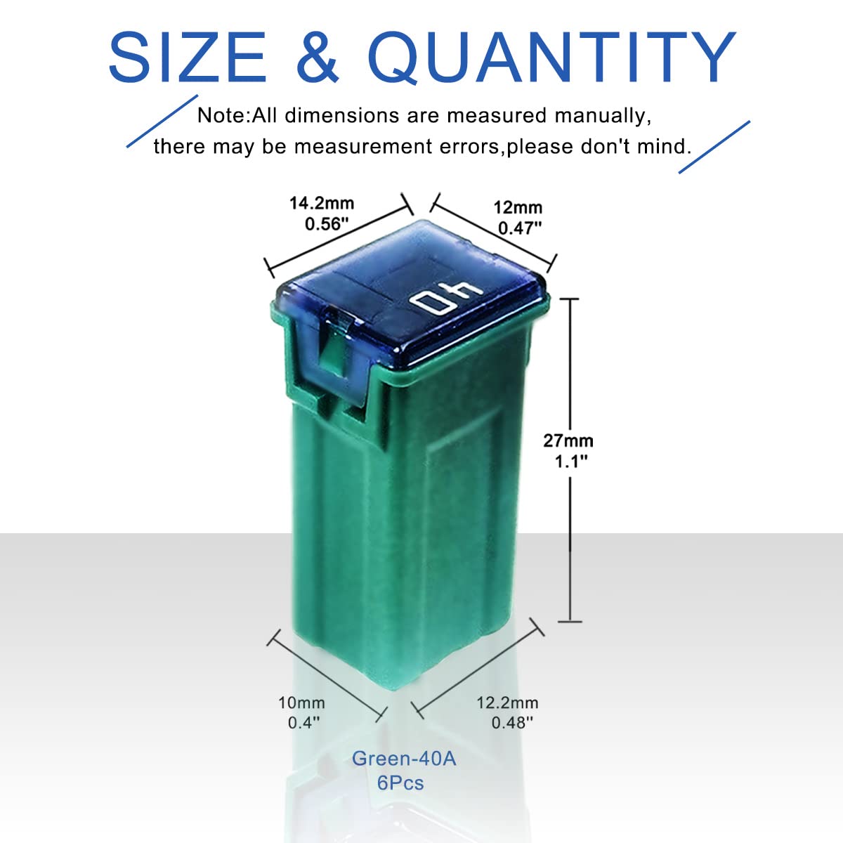 Time-delay automotive cartridge fuses are female standard fuses that provide a low voltage drop for protecting high-current circuits. Also called JCASE fuses, these slow-blow cartridge fuses tolerate temporary inrush currents without opening, which prevents nuisance-blowing from motor and equipment startups. They open to disconnect an electrical circuit when exposed to sustained loads and short circuits.Automotive cartridge fuses are rectangular fuses for protecting vehicle wiring harnesses against overcurrent. They're generally used in higher-voltage applications (up to 32VDC) than automotive blade fuses. They have a plastic housing that's color-coded by amperage rating to help prevent installation of a mismatched fuse.Why choose us:? These standard fuses are made of premium material, safer than normal fuses.? Compared with your local automotive store, they are cheaper than factory replacements.? A perfect solution for your automotive wiring and electrical equipment.? Protecting your vehicle and electrical devices from a short circuit or overload.Package Include:Tall Profile:Green 40amp x 6pcVersatile: widely used on car, truck, SUV, home, boat, camper/RV, ATV, UTV, golf cart, and more electrical devices. Please attention Don't get caught without the right fuses for your truck or SUV!?Note?:? Please check the specific size of the product according to the picture. ? If you have any questions, please feel free to contact us and we will try our best to help you.
