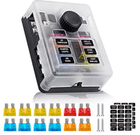 RAPID FIX --- Red LED warning light on fuse box will light up immediately when the corresponding fuse is blown. It is very safe and easy for you to find the problem and replace the blown fuse. | SAFE MATERIAL --- Made of environment fire-resist PBT material, this fuse box meets all the standards of an nice fuse block, which has high mechanical strength, good insulation, heat & flame resistance. It will hardly cause any issues like fracture, deformation, combustion or short circuit. | MAKE WIRING NEAT --- 12 volt fuse block with ground bus kit gives you 6 dedicated fuses and 6 ground locations to keep all of your wires clean, organized, and accessible. Made your wiring clean and tidy. | UNIVERSAL PROTECTION --- Whether you are building a large land-based lighting setup, or adding electric windows, The fuse box has a capacity of 100A, each fuse is 30A, and has a ground bus, which is enough to protect all your hard work. | Free Blade Fuses --- 6-Way fuse box Package includes: 4x 20A Fuse, 4x 15A Fuse,2x 10A Fuse, 2x 5A Fuse, 2x Labels, 4x Screws