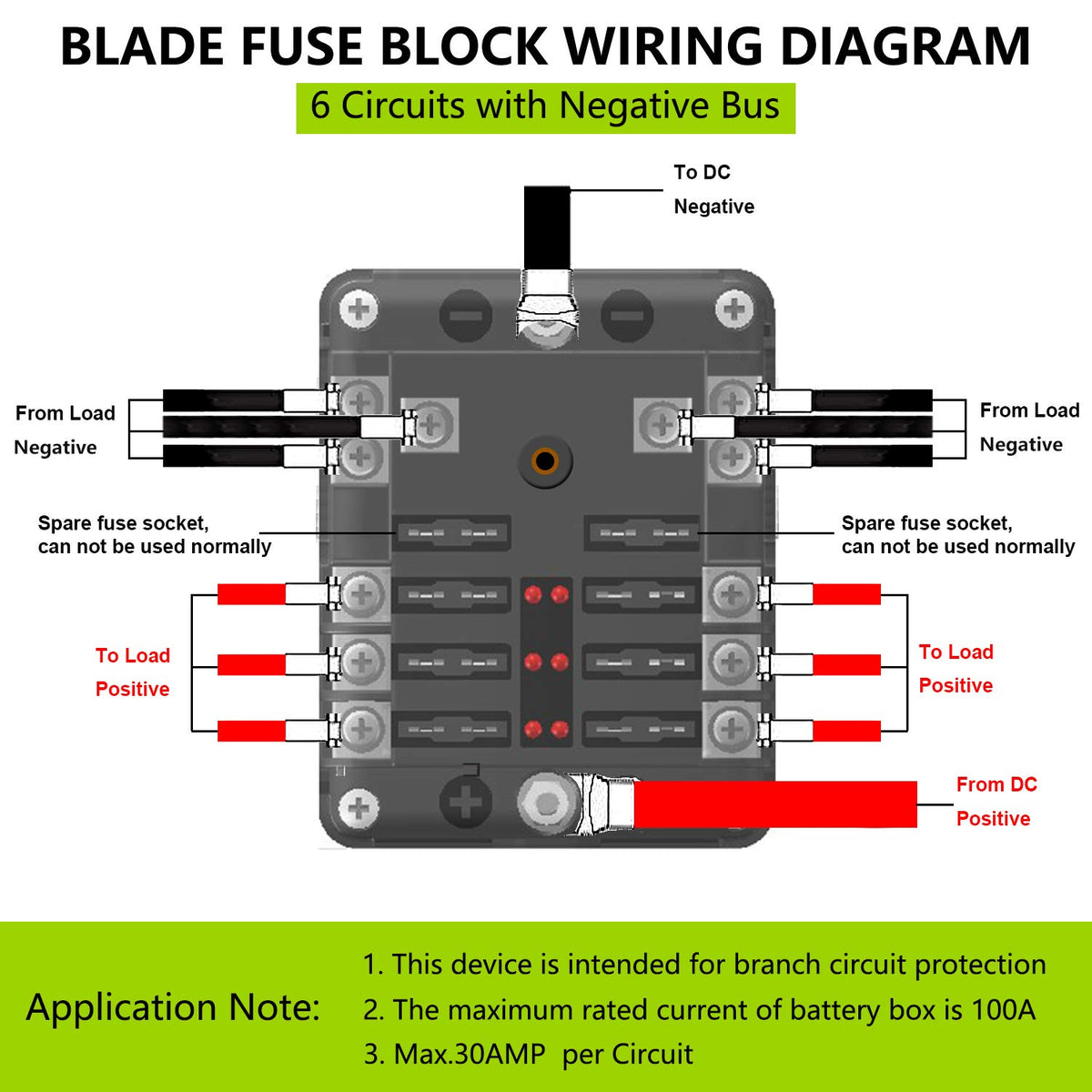 Interchangeable/Compatible with: All automobiles and devices equipped with a 10-32 Volt DC power source. Features: High quality construction. 70 pcs stick label. Maximum of 20 Amp per circuit and 75 Amp per panel. Clear cover included for additional protection. Input terminal rating:75A, 32V DC; M5 threaded studs. Input wire size:#4~6 AWG. Output terminal rating: 20A max Per Circuit. Output wire size:#12~16 AWG. Product Content: 1 x 6 Circuit Fuse Box Holder With Negative Bus. 1 Year Manufacturer Warranty.