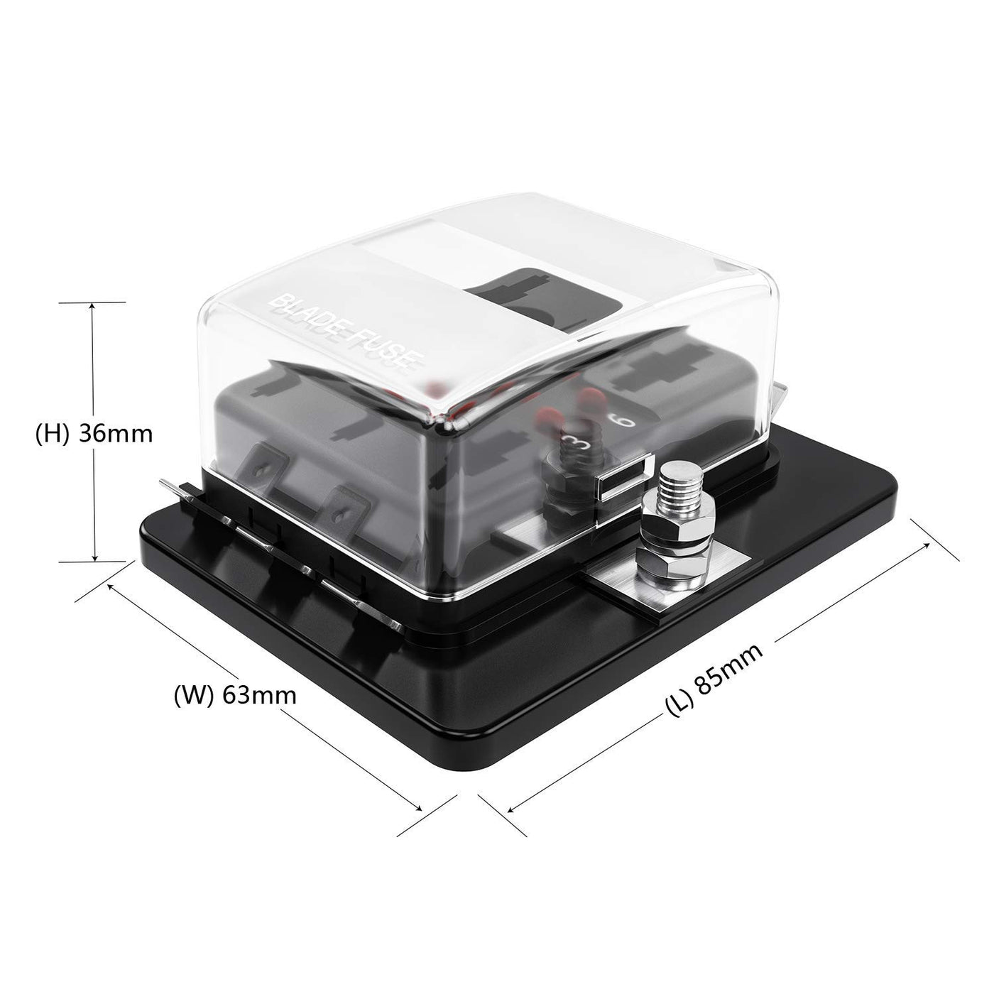 This 6-way blade fuse box waterproof is suitable for all kinds of automotive and marine applications, including 6v, 12v & 24v systems (maximum voltage 32v) Specifications Accepting fuse:Standard blade fuse (ATO / ATC) Quantity of circuits / fuse slots:6 Positive connection:M5 stud (5mm bolt) Output connections:Standard 6.3mm spade terminals Current rating per circuit / fuse:30 amp (Max.) Current rating per box:100 amp (Max.) Volt rating:32V DC (Max.) Dimension:approx. 3.34*2.48*1.39in Package size:3.35 * 3.85 * 1.55in Package weight:3.64oz What is in the Box 1 * Fuse Box Holder