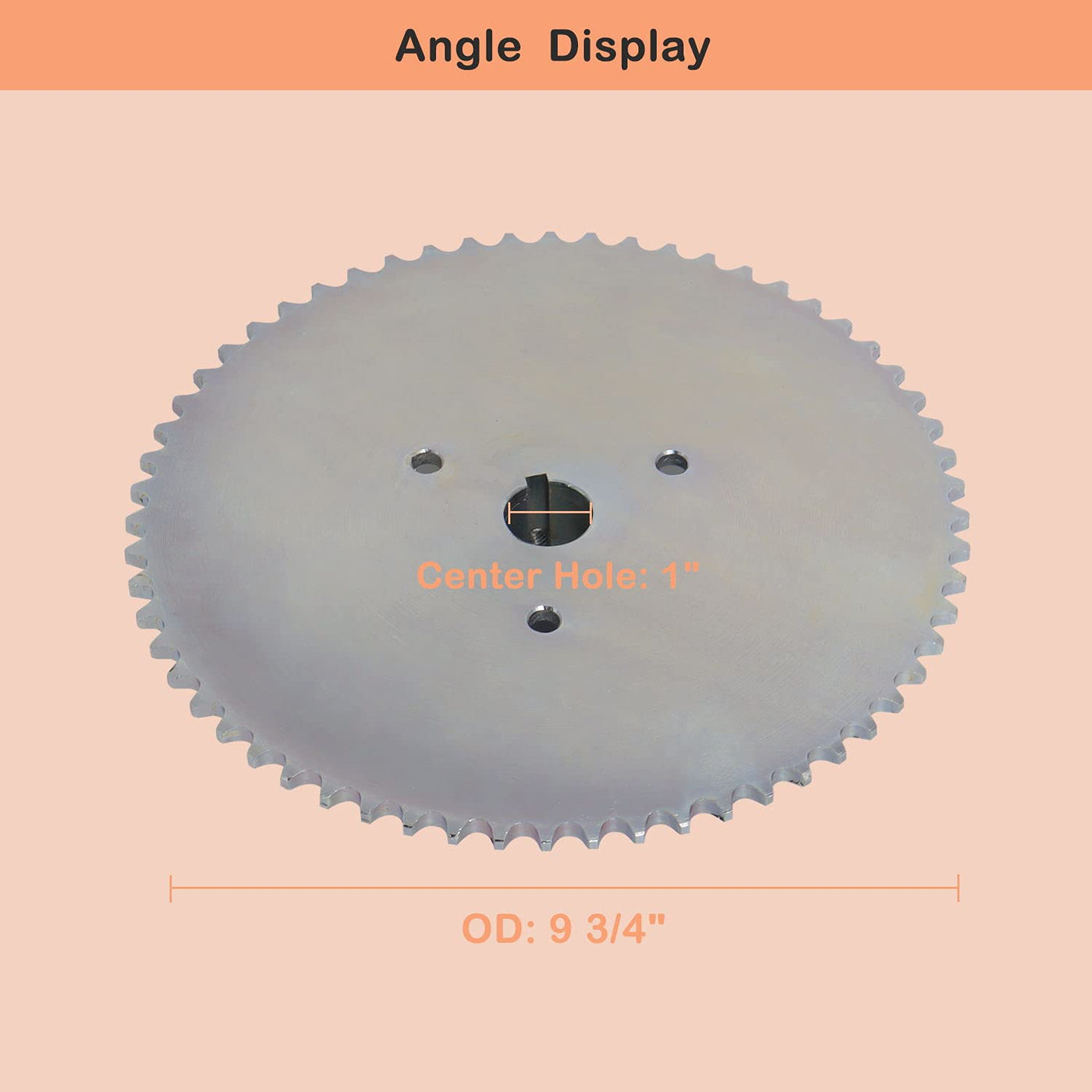 Q: What are the dimensions of the sprocket?A: The sprocket has a tooth count of 60, an outer diameter of 9 3/4 inches, and a center hole size of 1 inch.